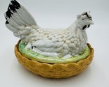 This antique Staffordshire Pottery figurine is a beautiful addition to any collection. The hand-painted, decorative design features a hen sitting on a nest surrounded by a charming farmhouse decor theme. The piece is made of porcelain and ceramic materials with a matte finish and stands at 6 inches tall.