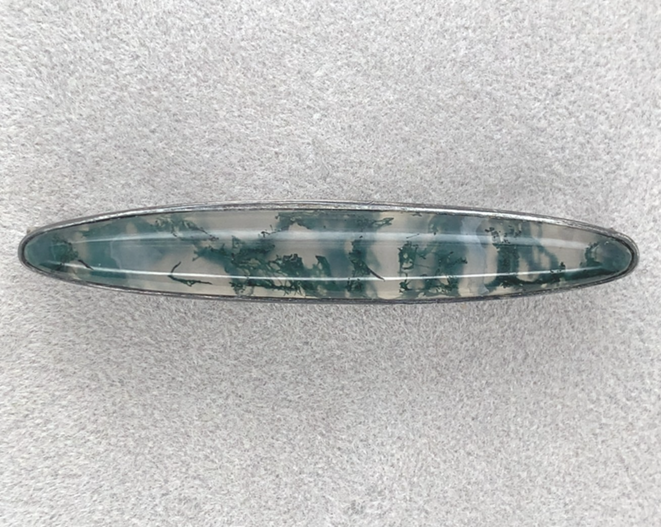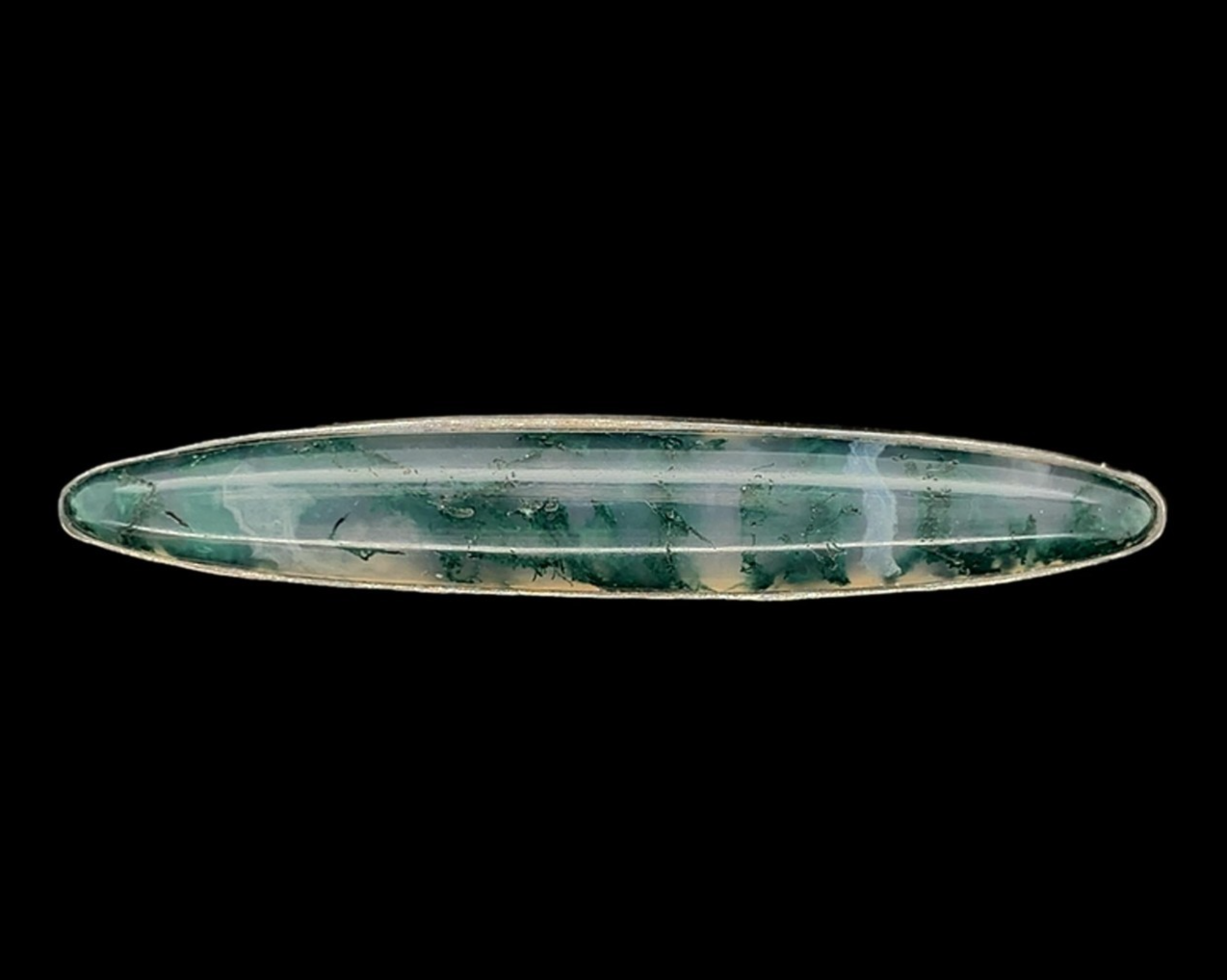 Sterling bar pin featuring an elongated cabochon cut moss agate. The agate measures about 44mm x 7mm. It is colorless translucent featuring thin forest green inclusions resembling moss. The pin measures 1 3/4" long by 1/4" wide and weighs 2.26 dwt. It dates from about 1900. The pin clasp appears to be replaced and is not silver.