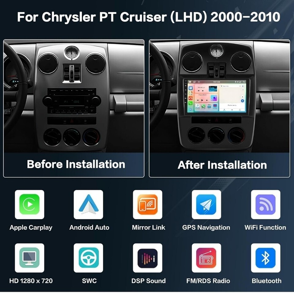 About this item Applicable Models Years: This upgraded replacement dash kit is for Chrysler PT Cruiser 2000 2001 2002 2003 2004 2005 2006 2007 2008 2009 2010 with left-hand drive. The stereo comes with an in-dash head unit, wiring harness cables, canbus decoder and frame panel. Include canbus decoder, need to match the model in "Settings - Factory Setup (Password 1234) - Can Settings". Please check if the power cable port on the detail page matches your original car before purchasing Upgrade 8 Cores 2+64G Android 13 Car Radio: For chrysler pt cruiser touch screen radio with IPS 1280 x 720 screen resolution, support 1920*1080P video playback. Fully capacitive 2.5D touch screen, easy to operate. Support 32-band EQ DSP options, allows you to enjoy a superior music listening experience. Touch the color circle in the lower left corner of the screen to switch between 19 backgrounds. Long press the main interface to switch 59 desktop themes CarPlay Android Auto Mirror Link: With car play touchscreen and built-in WIRELESS/wired CarPlay and Android Auto for superior voice-assisted control and easier access to your phone features, including music, navigation, calls, notification, messages and much more. (For Samsung, some cannot use Android Auto and Mirror Link; For Huawei, some cannot use Android Auto). For chrysler pt cruiser carplay radio can be synced to the onboard screen via WiFi hotspot or the phone's original USB cable GPS Navigation WiFi Hotspot: For chrysler pt cruiser accessories bluetooth contains a built-in GPS module, navigation software such as Waze and free offline maps can be used. With a WiFi/hotspot connection, the online map works perfectly, and you can also download apps from the Play Store such as YouTube, Tiktok, etc., which can enrich your car life Hand-free Bluetooth FM/RDS Radio: For chrysler pt cruiser car stereo supports hands-free calling, phone book download and music playback. The built-in microphone picks up your voice, and your car speaker lets you hear the person on the other side. Stable FM/RDS radio can preset 18 stations, providing channel broadcast, weather forecast and real-time road conditions AHD Backup Camera Steering Learn: Inefala for chrysler pt cruiser android auto is equipped with an AHD camera, and when connected to the rear camera, you can see video on the radio screen through the rearview camera when reversing. For chrysler pt cruiser display also supports the steering wheel button function, through which you can control the desired functions