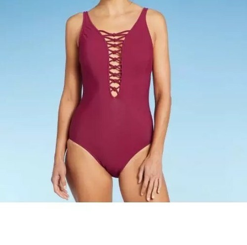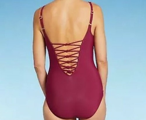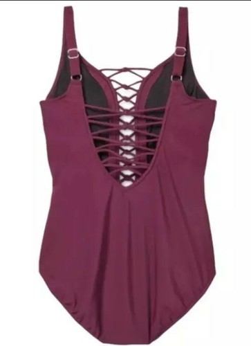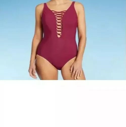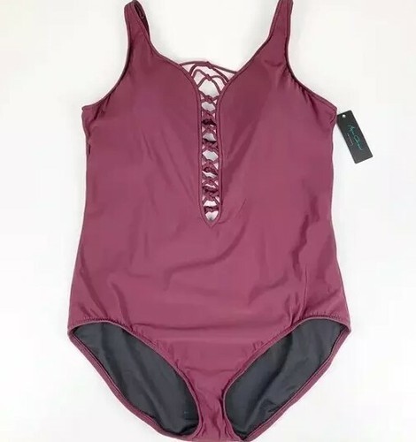 This Sale is for One (1) Aqua Green? Swimsuit Women's Size 18W Bra Size ~ 36DD ~ 38DD ~ 40C ~ 40D Bust ~ 43-45 Waist ~ 37-40 Hips 45"-47" Burgundy ~ Wine in Color (Nairoba) Front back plunge Intricate knot strappy detailing Crisscross Over the shoulder ~ adjustable straps Sewn in bra with removable soft cups One (1) Piece Swimming Suit Gold hardware Full bottom coverage UPF 50+ rating keeps you protected from harsh sun rays Shell is 80% Nylon ~ 20% Spandex Lining is 100% Polyester Swimsuit is new with tags Please view photos for a good description of this swimming suit Thank you!