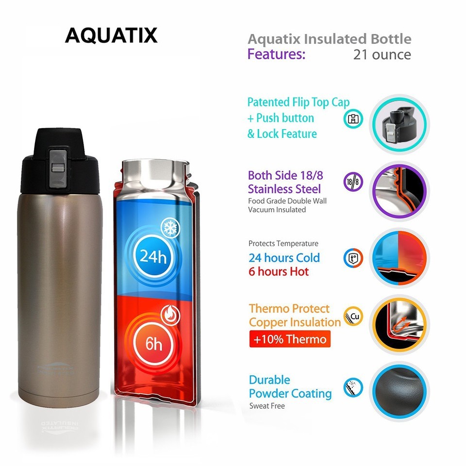 end_display_feedback_code_window Best Stainless Steel Water Bottle Or Your Money Back! - If Our 100% Pure Stainless Steel Sport Water Bottle (with No Plastic Lining Or Dangerous BPAs) Isn't The Best Sport Bottle you have ever tried we will Give You All Your Money Back! 100% GUARANTEED!!! KEEP DRINKS COLD FOR 24 HOURS, HOT FOR 6 -Our double-walled vacuum insulation technology keeps your drinks ice cold up to 24 hrs and toasty warm up to 6 hrs. Enjoy cold beverages all day long at work, during those long events, or at the beach! Engineered To Stay Dry Not Leak - Just Like The Tankers You See Driving On The Highways, Our 21oz Bottle Has Been Specially Engineered To Stay Dry And Not Leak. Stop Worrying About Liquids Sweating In Your Bag Or Purse, Our Bottle Is The Answer! 100% Pure 'true' Stainless Steel - Keep Drinks Cold 24 Hrs, Hot 6 Hrs don't Be Fooled By Imitators! Our Bottle Is Toxin-free, Food Grade Stainless Steel On Both Inside And Outside Walls! You Won't Have To Deal With Rust, Leaking, Dents, Or Issues That You Will With Cheap Imitators! Wide Drip-free Mouth With Non-leaking Cap -you Won't Find A Stainless Steel Water Bottle With A Better Design Anywhere Else Online. Treat Yourself To A Product That Actually Works! Our Bottle Is Your Ticket To A More Pleasing Lifestyle! Go for gold! The Aquatix Sport 21 oz Double Wall Insulated Stainless Steel Water Bottle is perfect for use at the gym, at the office, around your house and anywhere you need to take your beverage of choice with you. Made from durable and sturdy PREMIUM QUALITY, Top Chef 18/8 FOOD GRADE STAINLESS STEEL, this Aquatix Sporty 21 ounce water bottle is a great eco friendly sports bottle. The double wall insulated water bottle is PERFECT for carrying while walking, hiking, camping, use at the gym or just on the go- as it fits MOST car cup holders. No more spills and messes while driving! Ditch those plastic water bottles! GO HEALTHY with this BPA Free, FOOD GRADE stainless steel water bottle that holds a large capacity of liquids 21 fluid ounces and no longer worry about toxins and chemicals leaching into your beverage. Drink crisp, clean, healthy and refreshing drinks from Your Aquatix Water Bottle every time. Just Fill and Go! This sporty bottle features a flip top spout drinking mechanism allows the ease of staying hydrated even while on the go! The flip cap top provides single-handed drinking ability and is perfect for your busy life on the go! Stay hydrated and DRINK MORE WATER with this large capacity 21 ounce water bottle. Double vacuum insulated wall construction contributes to hot teas, soup, coffee or other blends being consistently hot for up to 6 hours. And, for cold water, smoothies, soft drinks, or anything you may need very cold, 24 hours of insulated confidence, guaranteed cold, period! The bottle will not "sweat", meaning it will not create condensation which may leave a "ring" of liquid on your expensive buried walnut side table. Easy to hand wash or clean, NO aftertaste after cleaning. COLD LIQUIDS or HOT LIQUIDS! This is a double wall insulated water bottle that is made of 18/8 food grade stainless steel water bottle! No other bottle has all the features of our Aquatix Sport Bottle!
