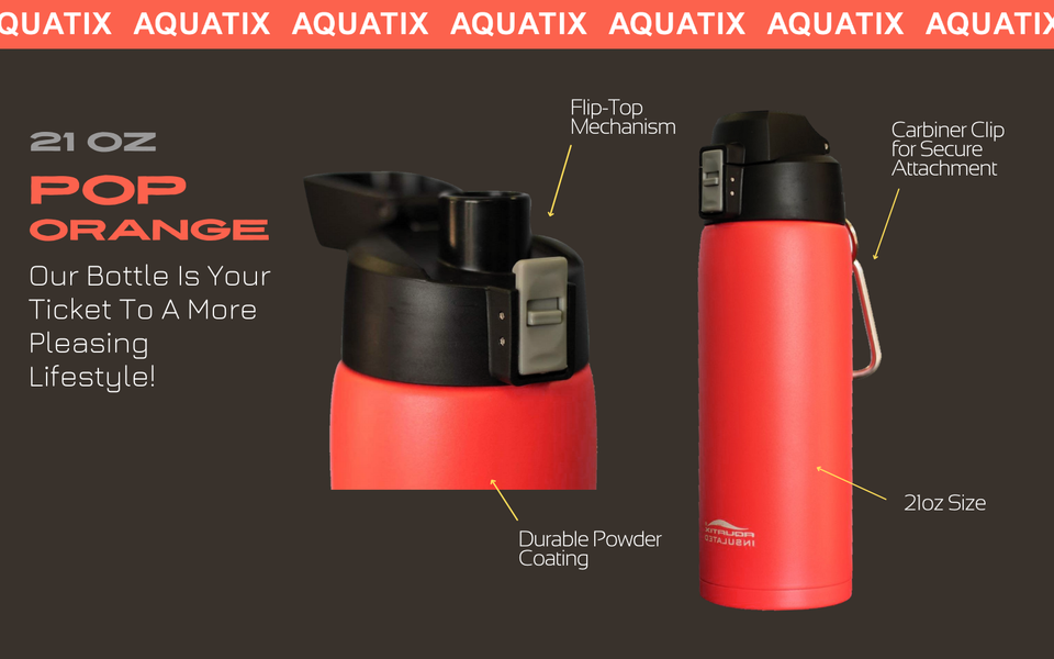 end_display_feedback_code_window Best Stainless Steel Water Bottle Or Your Money Back! - If Our 100% Pure Stainless Steel Sport Water Bottle (with No Plastic Lining Or Dangerous BPAs) Isn't The Best Sport Bottle you have ever tried we will Give You All Your Money Back! 100% GUARANTEED!!! KEEP DRINKS COLD FOR 24 HOURS, HOT FOR 6 -Our double-walled vacuum insulation technology keeps your drinks ice cold up to 24 hrs and toasty warm up to 6 hrs. Enjoy cold beverages all day long at work, during those long events, or at the beach! Engineered To Stay Dry Not Leak - Our 21 oz Bottle Has Been Specially Engineered To Stay Dry And Not Leak. Stop Worrying About Liquids Sweating In Your Bag Or Purse, Our Bottle Is The Answer! 100% Pure 'true' Stainless Steel - Keep Drinks Cold 24 Hrs, Hot 6 Hrs don't Be Fooled By Imitators! Our Bottle Is Toxin-free, Food Grade Stainless Steel On Both Inside And Outside Walls! You Won't Have To Deal With Rust, Leaking, Dents, Or Issues That You Will With Cheap Imitators! Wide Drip-free Mouth With Non-leaching Cap -you Won't Find A Stainless Steel Water Bottle With A Better Design Anywhere Else Online. Treat Yourself To A Product That Actually Works! Our Bottle Is Your Ticket To A More Pleasing Lifestyle! The Aquatix Sporty 21 oz Double Wall Insulated Stainless Steel Water Bottle is perfect for use at the gym, at the office, around your house and anywhere you need to take your beverage of choice with you. Made from durable and sturdy PREMIUM QUALITY, Top Chef 18/8 FOOD GRADE STAINLESS STEEL, this Aquatix Sporty 21 ounce water bottle is a great eco friendly sports bottle. The double wall insulated water bottle is PERFECT for carrying while walking, hiking, camping, use at the gym or just on the go- as it fits MOST car cup holders. No more spills and messes while driving! Ditch those plastic water bottles! GO HEALTHY with this BPA Free, FOOD GRADE stainless steel water bottle that holds a large capacity of liquids 21 fluid ounces and no longer worry about toxins and chemicals leaching into your beverage. Drink crisp, clean, healthy and refreshing drinks from Your Aquatix Water Bottle every time. Just Fill and Go! This sporty bottle features a flip top spout drinking mechanism allows the ease of staying hydrated even while on the go! The flip cap top provides single-handed drinking ability and is perfect for your busy life on the go! Stay hydrated and DRINK MORE WATER with this large capacity 21 ounce water bottle. Double vacuum insulated wall construction contributes to hot teas, soup, coffee or other blends being consistently hot for up to 6 hours. And, for cold water, smoothies, soft drinks, or anything you may need very cold, 24 hours of insulated confidence, guaranteed cold, period! The bottle will not "sweat", meaning it will not create condensation which may leave a "ring" of liquid on your expensive buried walnut side table. Easy to hand wash or clean, NO aftertaste after cleaning. COLD LIQUIDS or HOT LIQUIDS! This is a double wall insulated water bottle that is made of 18/8 food grade stainless steel water bottle! No other bottle has all the features of our Aquatix Sport Bottle!