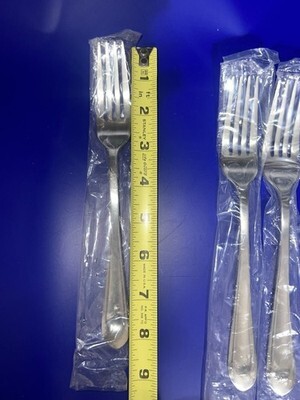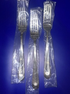 Set of three Argent Orfevres Nova Satin place forks, also called continental dinner forks, each measuring 8 1/8 inches long. These pieces are new in plastic and unused, preserved in their original protective sleeves. Crafted in Vietnam from durable 18/10 stainless steel with a satin finish, the Nova Satin pattern was produced during the 1990s through the early 2000s and is now discontinued. Finding unused examples is rare, and smaller sets like this are perfect for replacements when just one or two forks are missing from a collection. Each fork is stamped Argent 18/10 Stainless Vietnam. Please see photos for exact details of the forks offered in this set. Not in a box. Not sold with any other flatware. Only get these three forks in the pictures