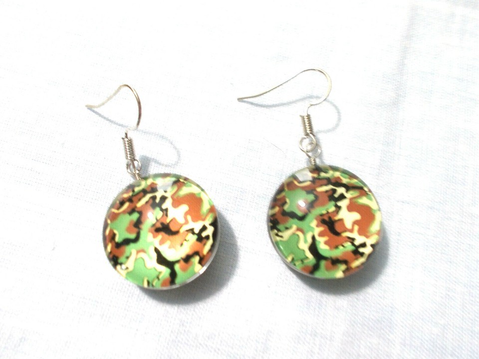 - ARMY CAMO GREEN BROWN TAN and BLACK DOUBLE SIDED GLASS ROUND PAIR OF EARRINGS
