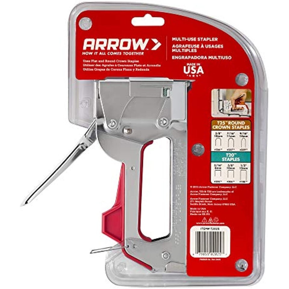 Product Description The Arrow T2025 low profile all steel construction stapler can hold a full strip of T20 flat crown or T25 round crown staples. This multi purpose stapler has a lock down handle, staple height adjustment guide, a patented jam proof mechanism as well as an ?easy squeeze? double leverage operation. Shooting two types and 7 sizes of staples, make it ideal for all types of low voltage wiring jobs up to OE? wide. Installing telephones, intercoms, security cameras, burglar alarm systems, cable TV and computers are just a few applications. Works with T25 staple size 3/8-inch (10mm), 7/16 (11mm), 9/16-inch (14mm), and T20 staple sizes 5/16-inch (8mm), 3/8-inch (10mm), 1/2-inch (12mm). From the Manufacturer Arrow's T2025 Dual Purpose Staple Gun Tacker is a remarkable staple gun that shoots both round crown staples for wire and cable up to 1/4-inch (6mm) in diameter and flat crown staples for standard stapling jobs. The T2025 features and exclusive built-in adjustable staple guide that allows it to change the depth of the staples being driven. This tacker works well with wire, cable, vapor barriers, upholstery, etc.
