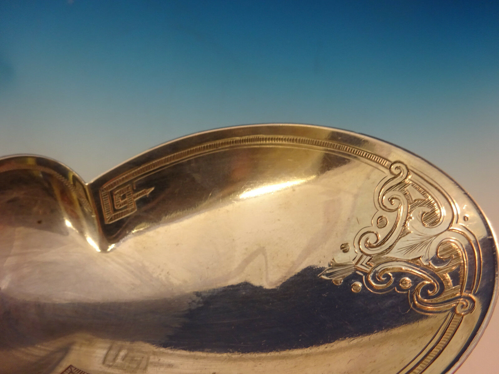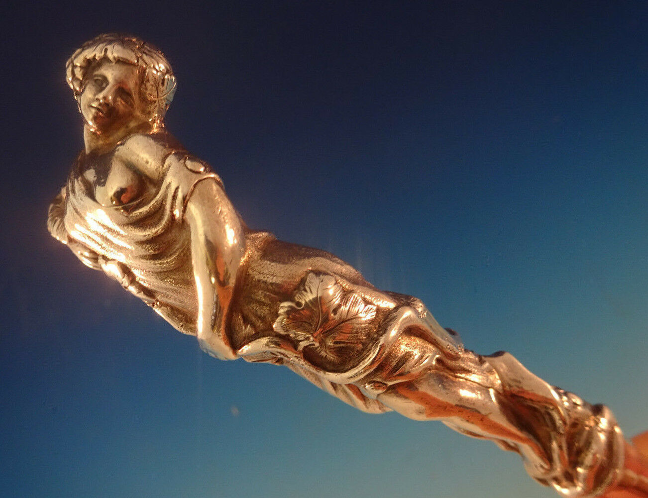 Superb Art silver hollow handle Large Berry Spoon with three-dimensional sculptural Greek or Roman woman draped in fabric and wrapped with grape vines, grape leaves, and clusters of grapes, measuring 11 1/2" - likely by Wendt (unmarked), and retailed by JE Caldwell, circa 1870's. It is monogrammed "B" on the reverse of the bowl and is in very good condition. There is a small ding in the bowl that is only noticeable upon close inspection. The bowl is decorated with Hand engraved designs and Greek key designs. Exceptional!