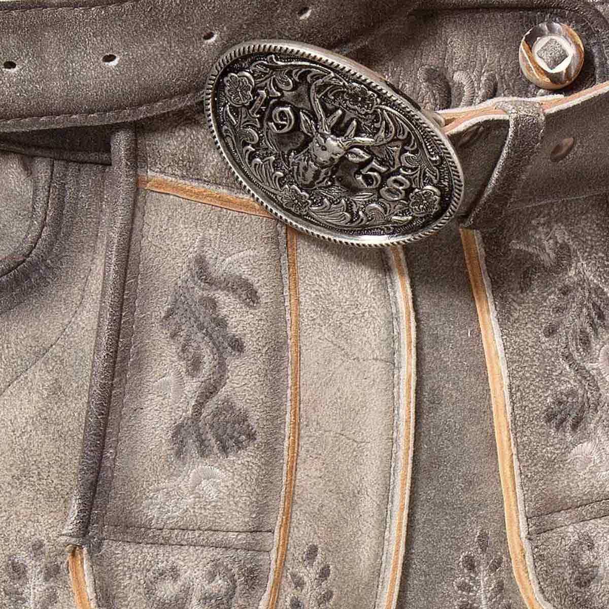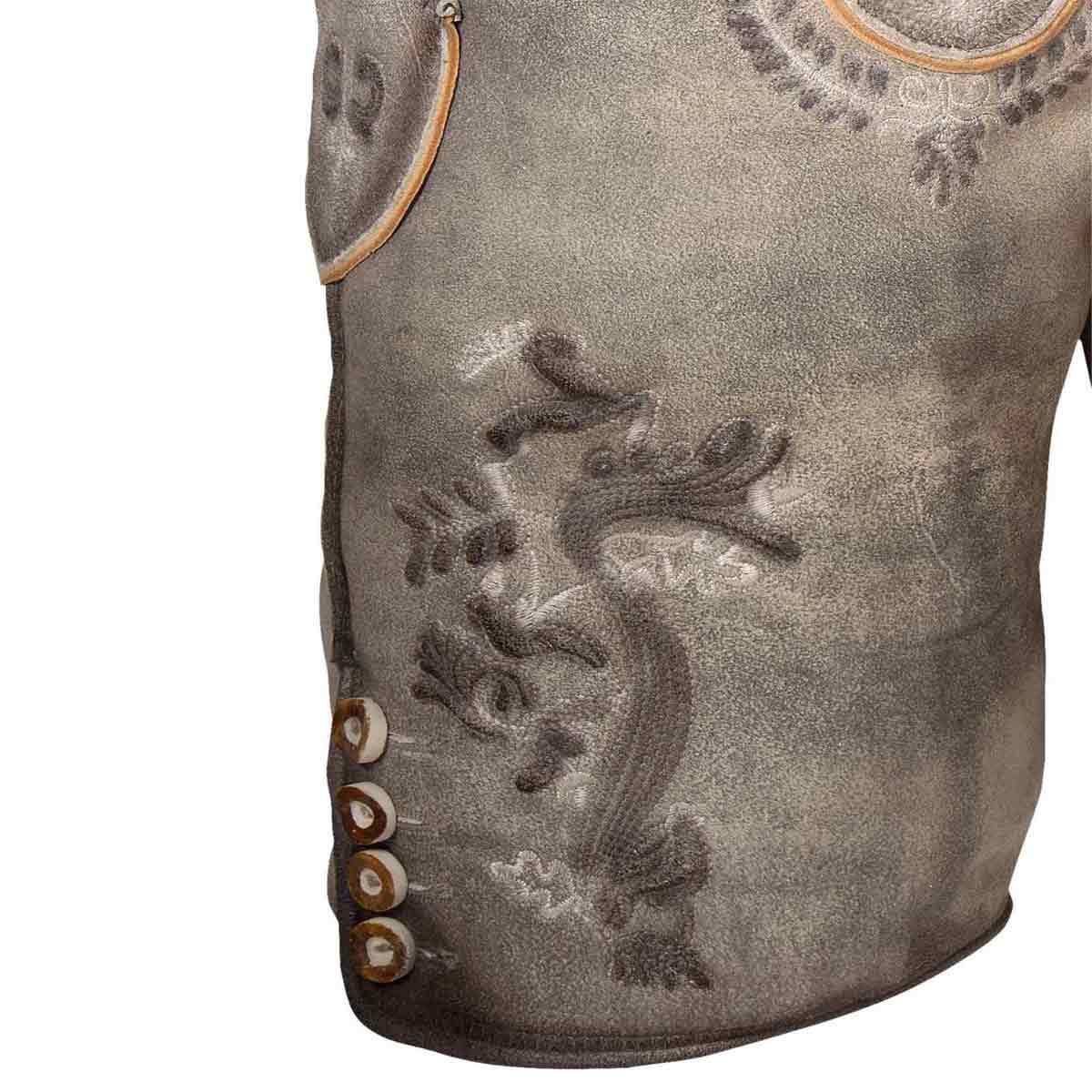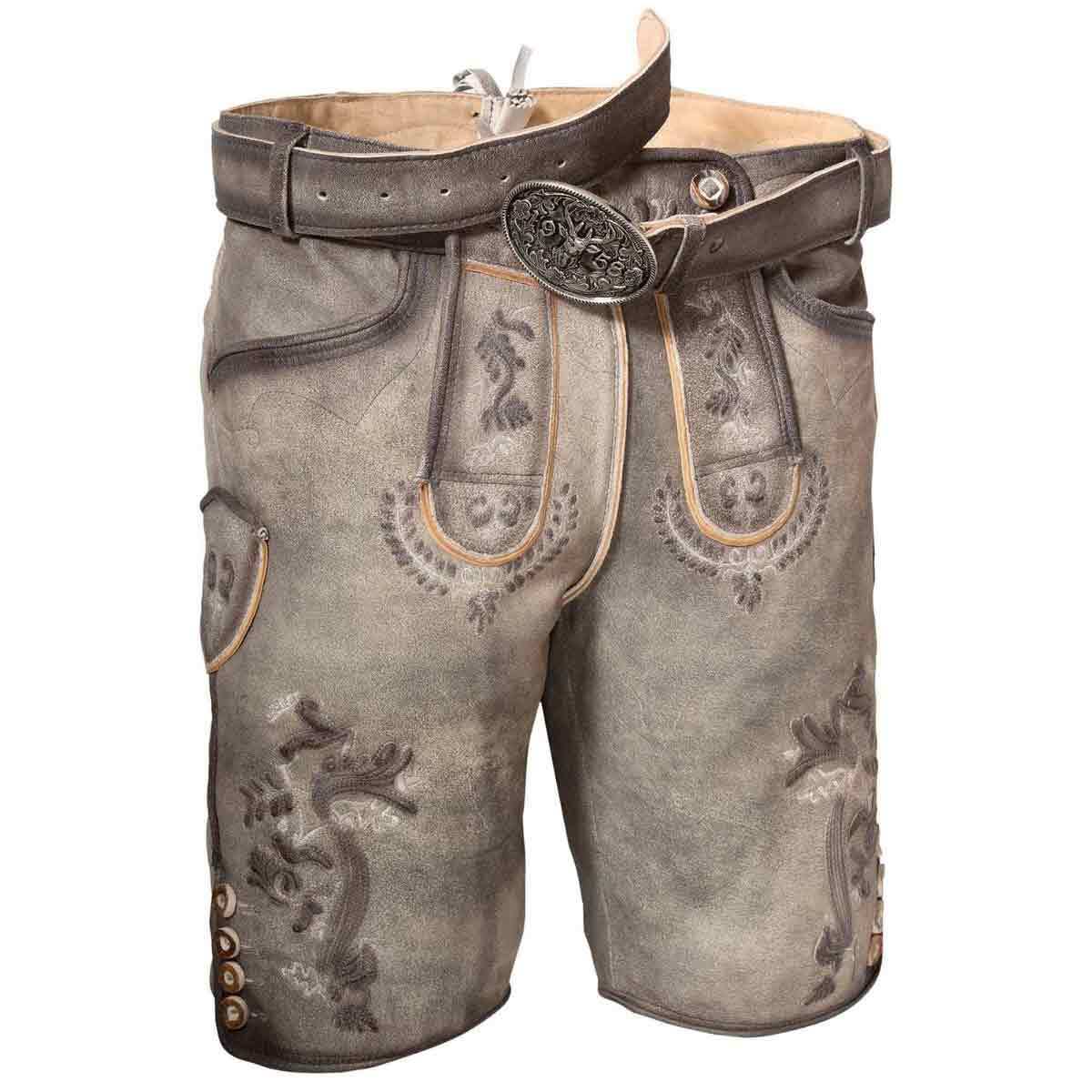 Ashen Glory Lederhosen. Meticulously crafted from high-quality distressed leather in a weathered gray-brown hue, this piece combines timeless Alpine aesthetics with modern practicality. Perfect for cultural events, outdoor gatherings, or everyday wear, these lederhosen offer unmatched durability and comfort while highlighting classic craftsmanship.
