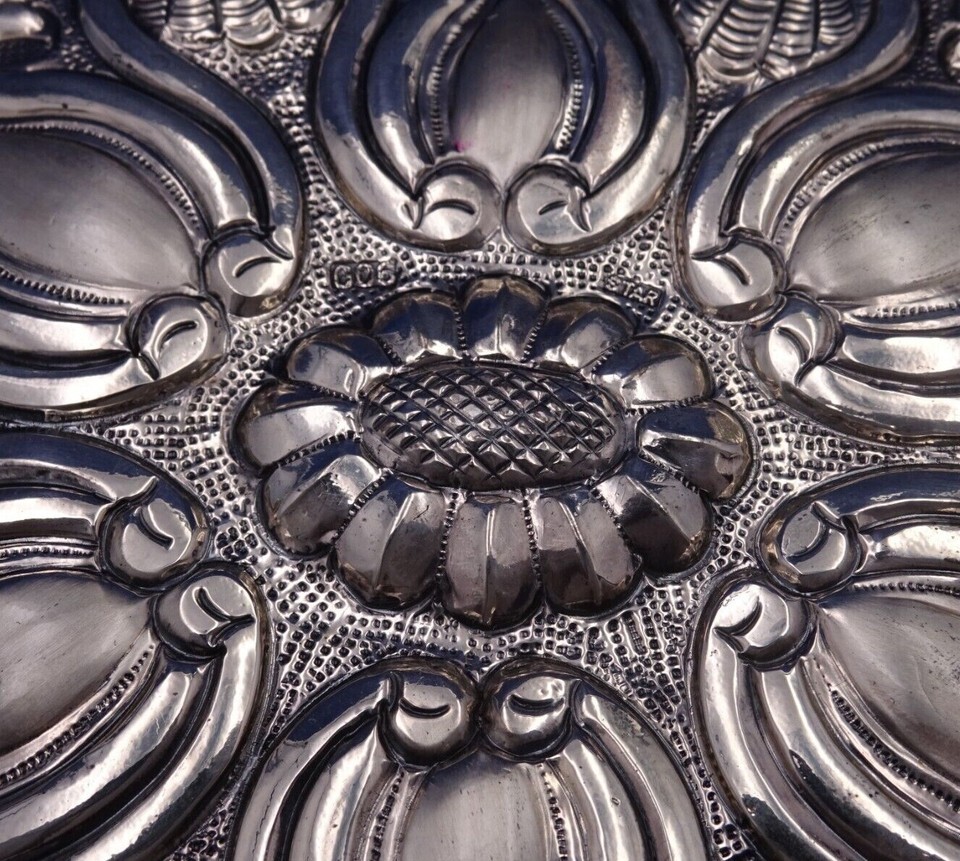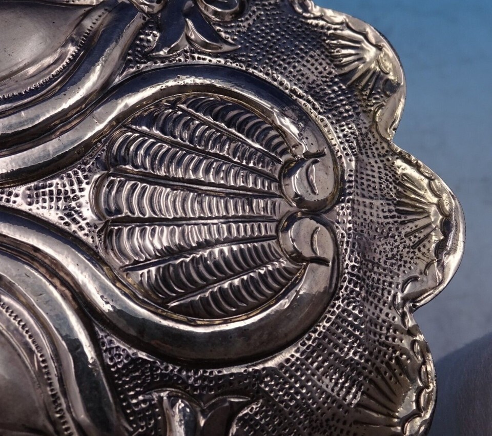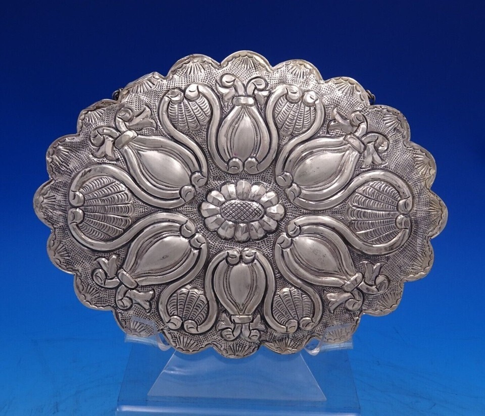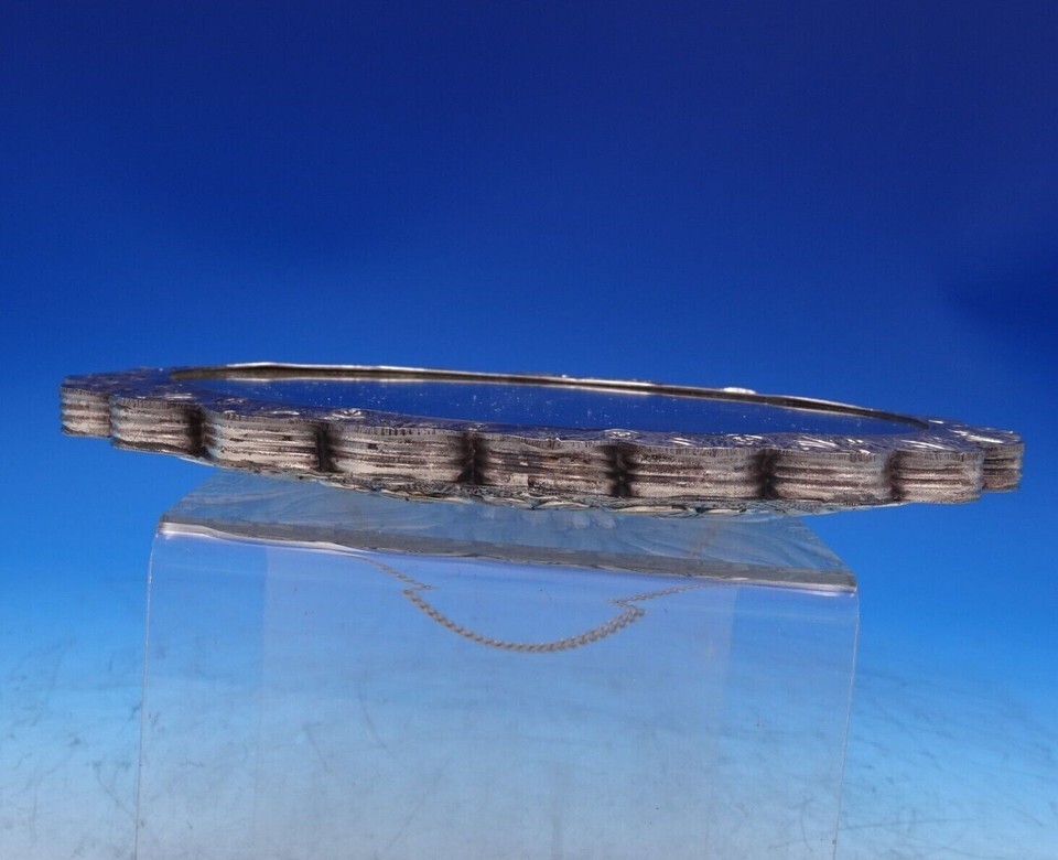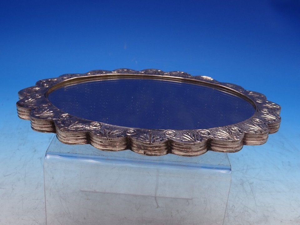 Lovely Asian sterling silver oval hanging mirror with chain (unmarked/maker unknown). This mirror measures 8 1/4" (l) x 6 1/8" (w). It is not monogrammed and is in good vintage condition as shown in the photos. Pretty!