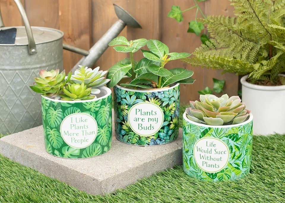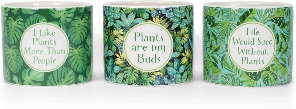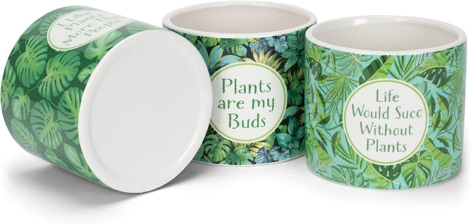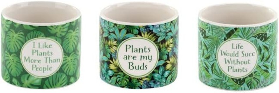 Each pot carries a unique sentiment - "I Like Plants More Than People," "Plants are my Buds," and "Life Would Succ Without Plants."