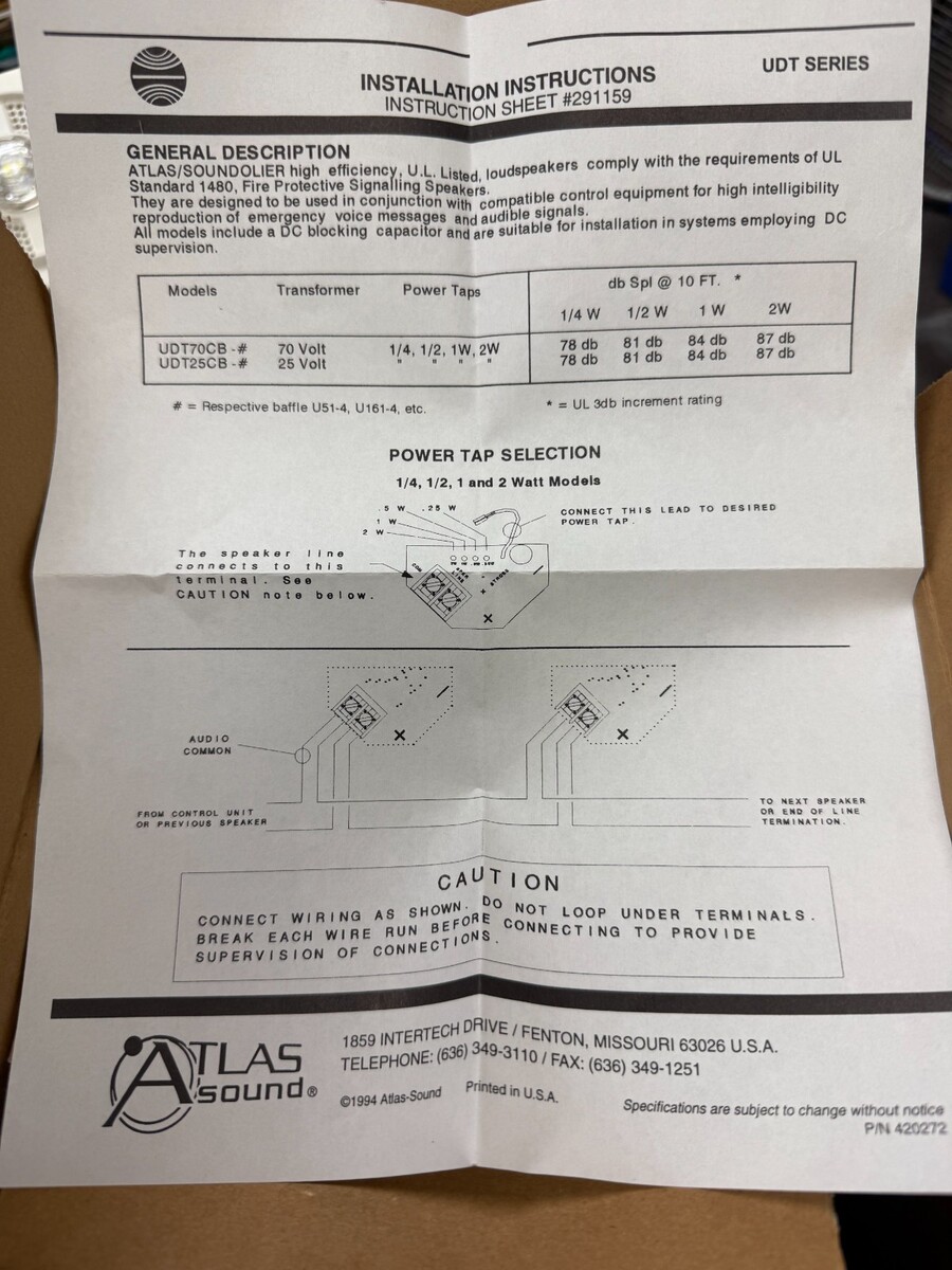 - Atlas Sound UDT70CB-U161-4 FIRE PROTECTIVE SIGNALING SPEAKER BRAND NEW