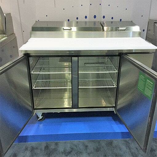 FREE SHIPPING/FREE LIFT GATE NEW 67" 2 DOOR PIZZA PREP TABLE WITH 19.5" DEEP PLASTIC CUTTING BOARD AND CASTERS DIMENSIONS 67" X 35.2" X 45.4" HIGH, THE DEPTH INCLUDES THE REMOVABLE CUTTING BOARD, WITHOUT IT IS 33" DEEP . FEATURES: COMES STANDARD WITH CASTERS, ADJUSTABLE INTERIOR SHELF, STAINLESS STEEL FLOOR IN UNIT, STANDARD 120 VOLT WALL PLUG, EXTRA DEEP TRUE 19.5" FULL LENGTH REMOVABLE PLASTIC CUTTING BOARD, COMES WITH 9 EACH 1/3 STAINLESS HOTEL PANS, EXTERIOR AND INTERIOR OF PIZZA PREP IS STAINLESS STEEL, LOW ENERGY CONSUMPTION, LARGE INTERIOR CUBIC FOOTAGE, TEMPERATURE RANGE FROM 33 TO 45 DEGREES F. FORCED AIR CASCADE SYSTEM. THIS NEW 67" PIZZA PREP TABLE COMES WITH A 5 YEAR COMPRESSOR WARRANTY AND 2 YEARS ON PARTS AND LABOR. ORDERS SHIP IN 24 HOURS