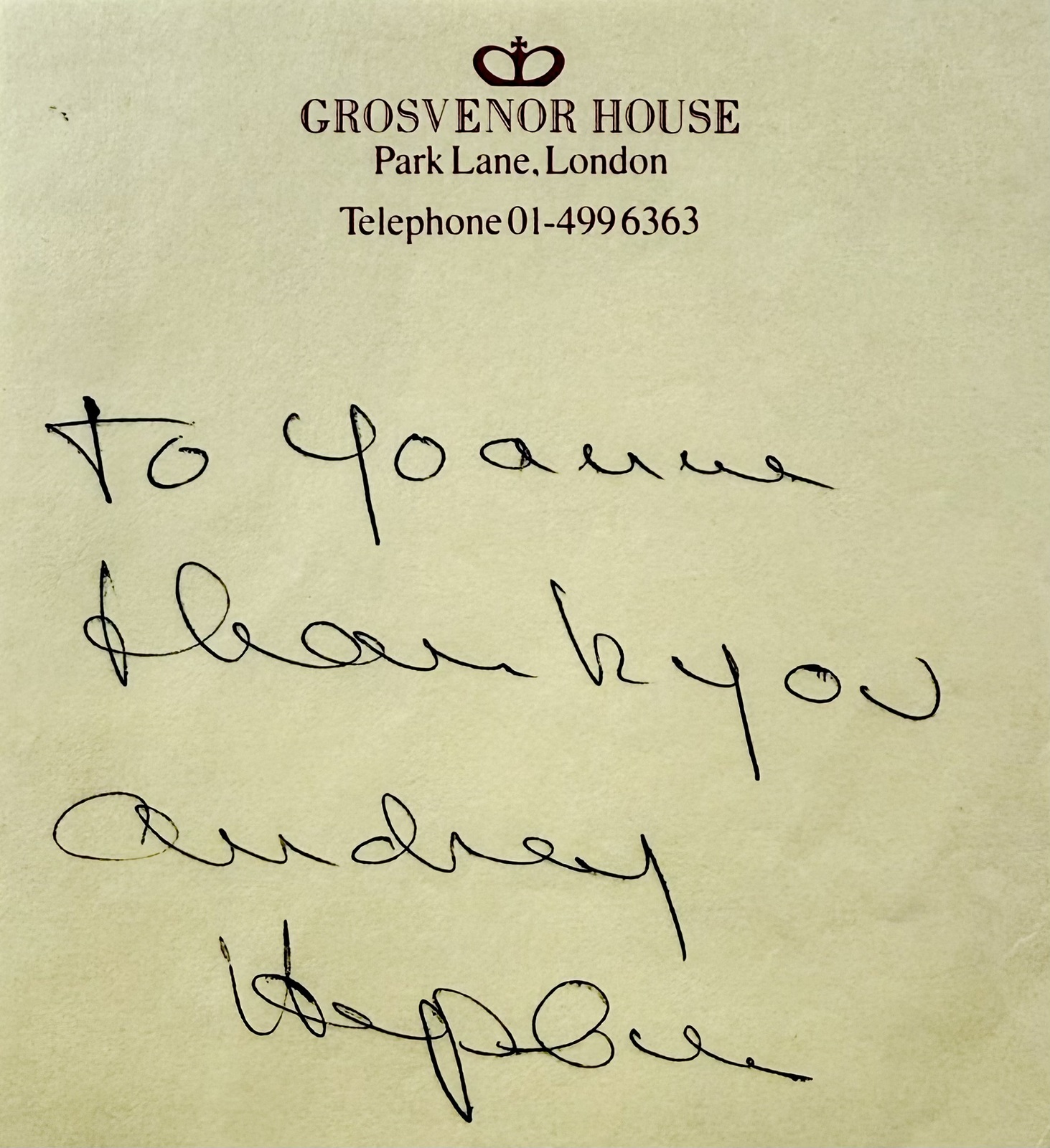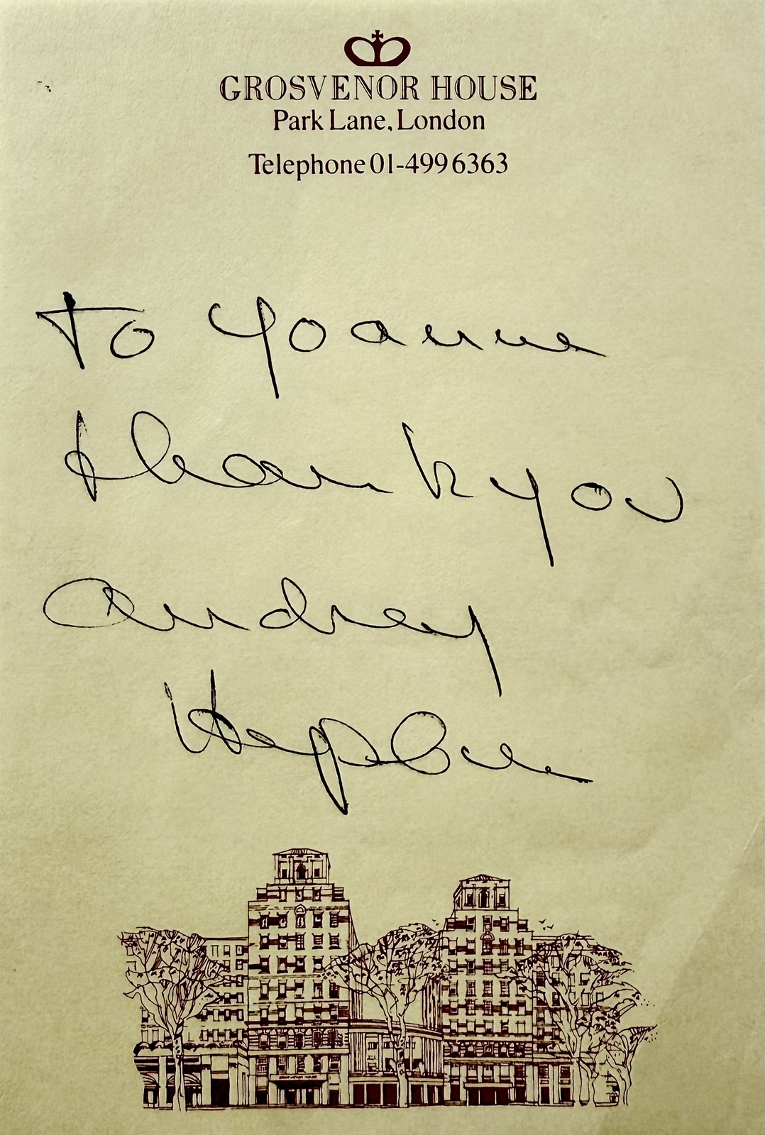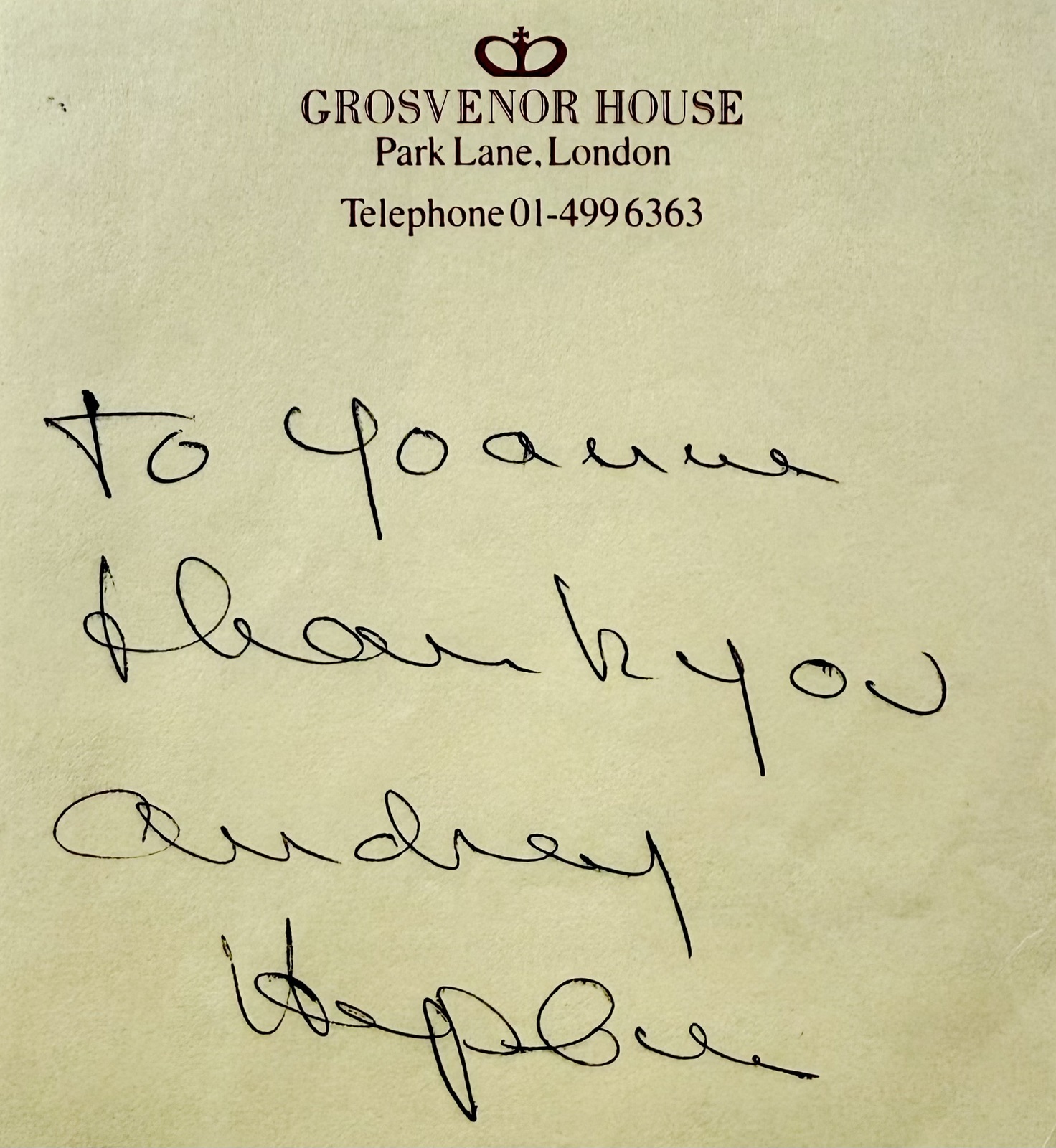 - AUDREY HEPBURN Signed Autographed NOTE 4" x 6" Grosvenor House, London JSA LOA