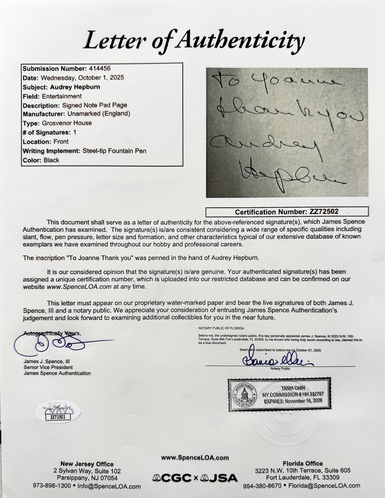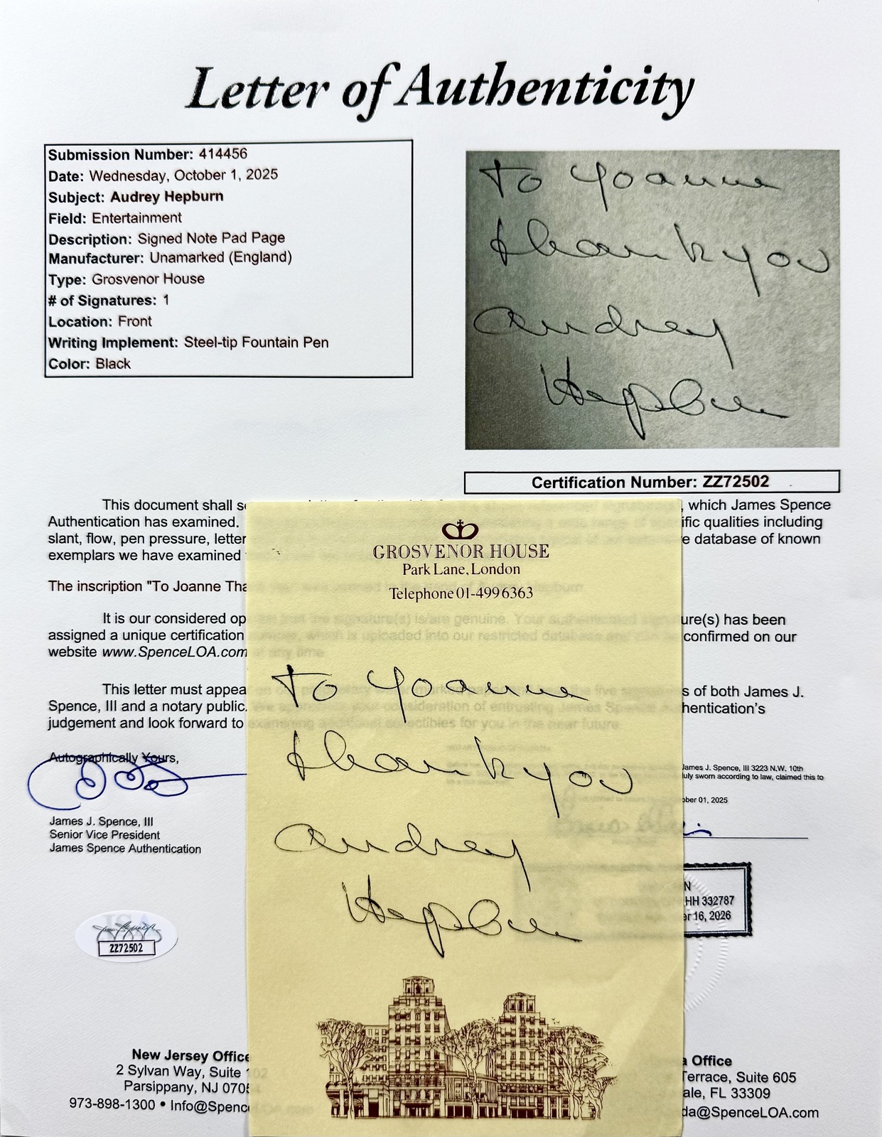 Audrey Hepburn (May 4,1929 - January 20,1993) autographed 4" x 6" yellow Grosvenor House Park Lane, London Note Pad Page signed in black steel-tip fountain pen and inscribed To Joanne Thank you Audrey Hepburn. This signature has been authenticated by JSA James Spence authentication Certification Number: ZZ72502 and will come with the Letter of Authenticity you see in the scans. Audrey Hepburn was a Belgian-born British actress and humanitarian. An icon of film and fashion, she won an Academy Award for her role as Princess Ann in Roman Holiday (1953). Credits include Breakfast at Tiffany's (1961), Charade (1963), My Fair Lady (1964), Always (1989), Love Among Thieves (1987), They All Laughed (1981), Bloodline (1979), Robin and Marian (1976), Wait Until Dark (1967), Two for the Road (1967), How to Steal a Million (1965), Paris When It Sizzles (1964), The Children's Hour (1961), The Unforgiven (1960), The Nun's Story (1959), Green Mansions (1959), Love in the Afternoon (1957), Funny Face (1957), Producer's Showcase (1957), War and Peace (1956), Sabrina (1954), We Go to Monte Carlo (1953), CBS Television Workshop (1952), Betty Crocker Star Matinee (1952), Secret People (1952), Young Wives' Tale (1951), Nous irons a Monte Carlo (1951), BBC Sunday-Night Theatre (1951), The Lavender Hill Mob (1951), Laughter in Paradise (1951), One Wild Oat (1951), Saturday-Night Revue (1950), and Sauce Tartare (1949). Buy with confidence we have been selling autographs since 1992.