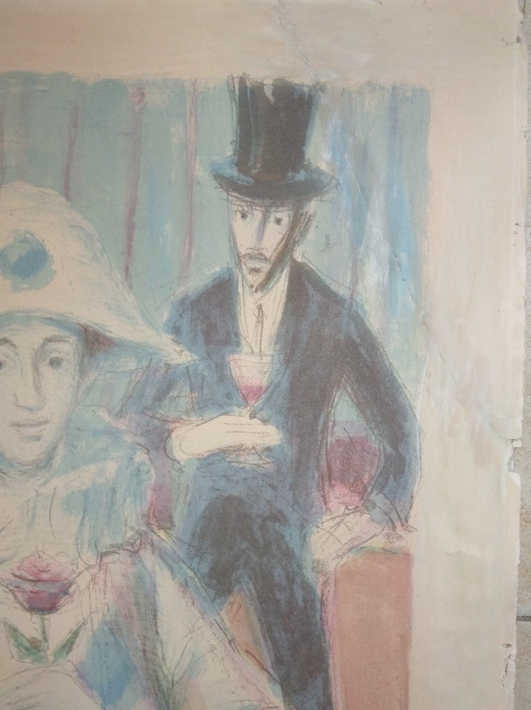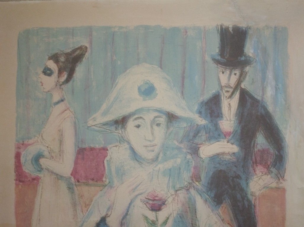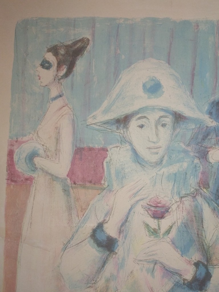 Color Lithograph "Harlekin mit Rose und 2 Maskierte Personen beim Maskenball" (1960)