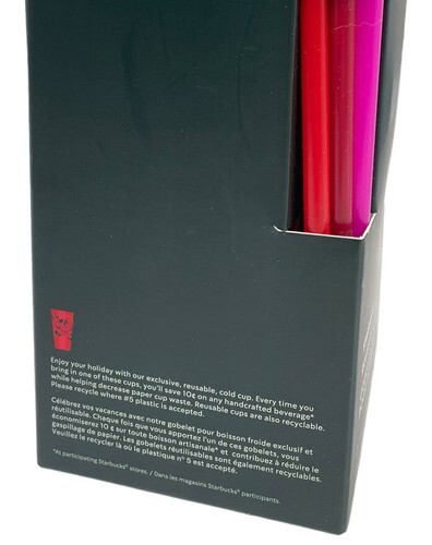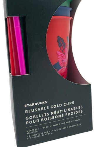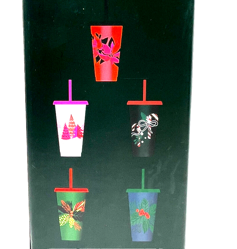 Starbucks 2021 Holiday Reusable Cold Cups Set 5 Pack (15 pieces in all) Set includes 5 each of reusable cups, lids straws Each cup holds 24 fluid ounces New in box - Photos are of the actual items you will receive. The photos are useful for seeing condition and other details.