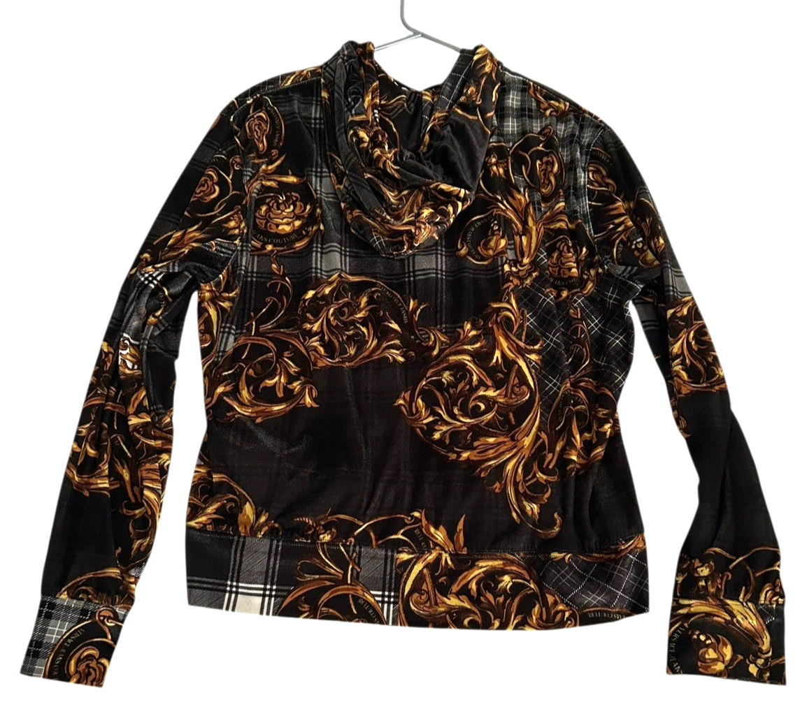The Mens Authentic Versace Jeans Tartan Plaid Style Couture Baroque Full Zip Hoodie in XL is a rare and stylish sweater made in Italy. This hoodie features a geometric pattern in multiple colors, a full zip style, and a regular fit for a comfortable and fashionable look. Perfect for casual occasions, this high-quality Versace hoodie is a must-have for any man's wardrobe. It feels like velour velvety to the touch. Really nice feeling!