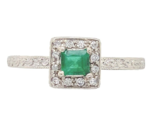 10K white gold emerald and diamond ring. The earth mined square step cut emerald has bright grass green color. It measures about 3.5mm and weighs .19ct. There are twelve small round diamond accents measuring about 1.4mm. There is a scrollwork pattern on three sides of the band almost 1/2 way around the ring.