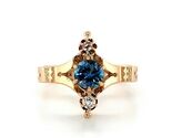 10k yellow gold ring featuring a round genuine aquamarine weighing .48cts and measuring about 4.9mm. The aqua has great medium blue-green color. There are two antique diamond accents measuring about 1.8mm (one is rose cut and the other is European cut).