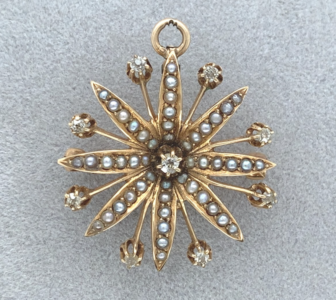 13k yellow gold Victorian seed pearl and diamond starburst pin. The pin measures 1 1/8" in diameter. There are about forty-eight tiny seed pearls measuring about 1mm-2mm. The seed pearls are cream to grey in color. There are nine chunky European cut diamonds measuring about 1.5mm to 2mm. There is a folding bail to be worn as a pendant. The folding bail loop is getting thin.