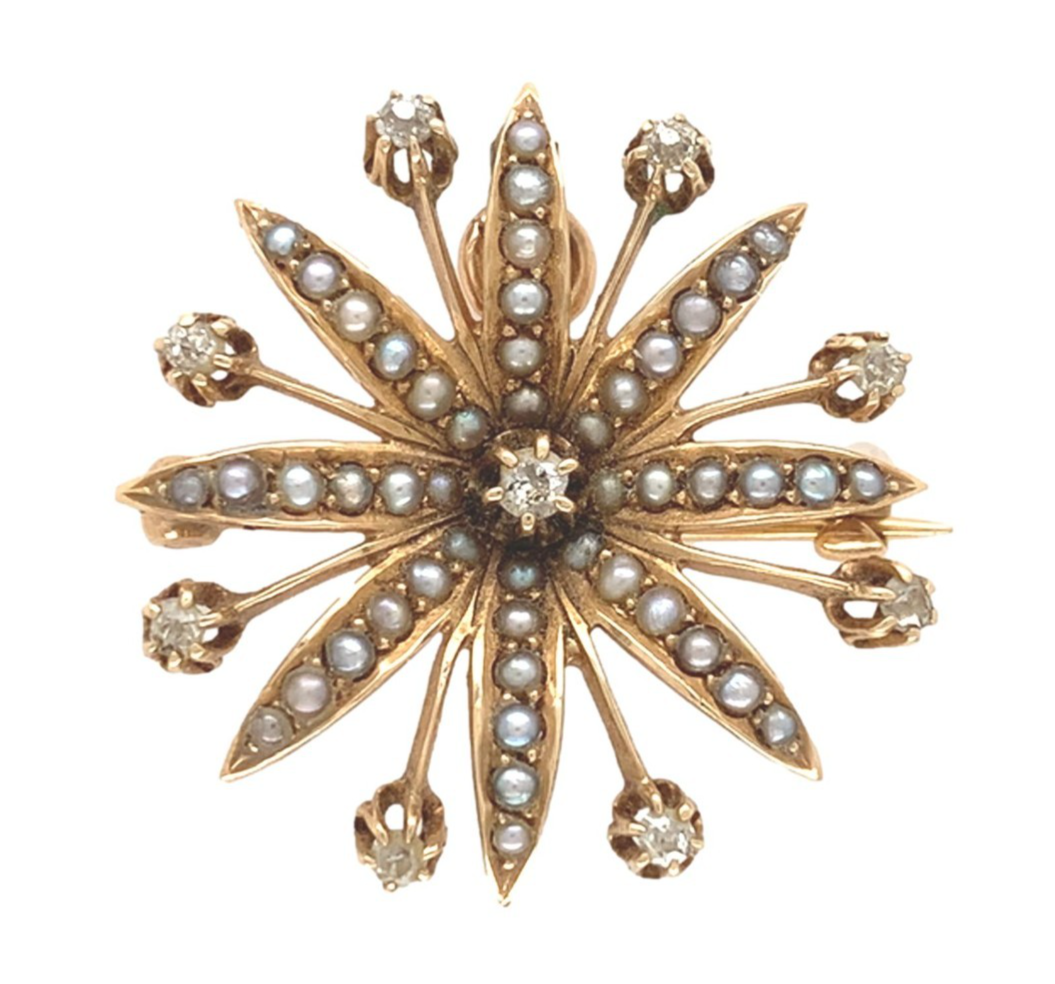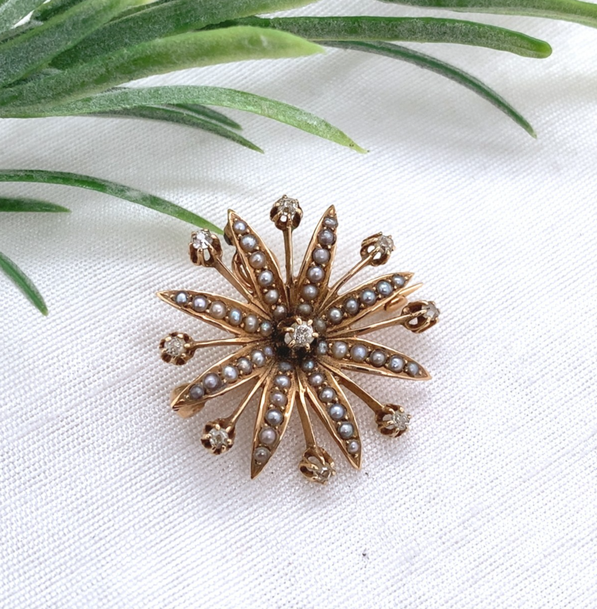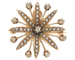13k Yellow Gold Victorian Diamond and Seed Pearl Startburst Brooch Pin (#J7437)