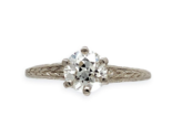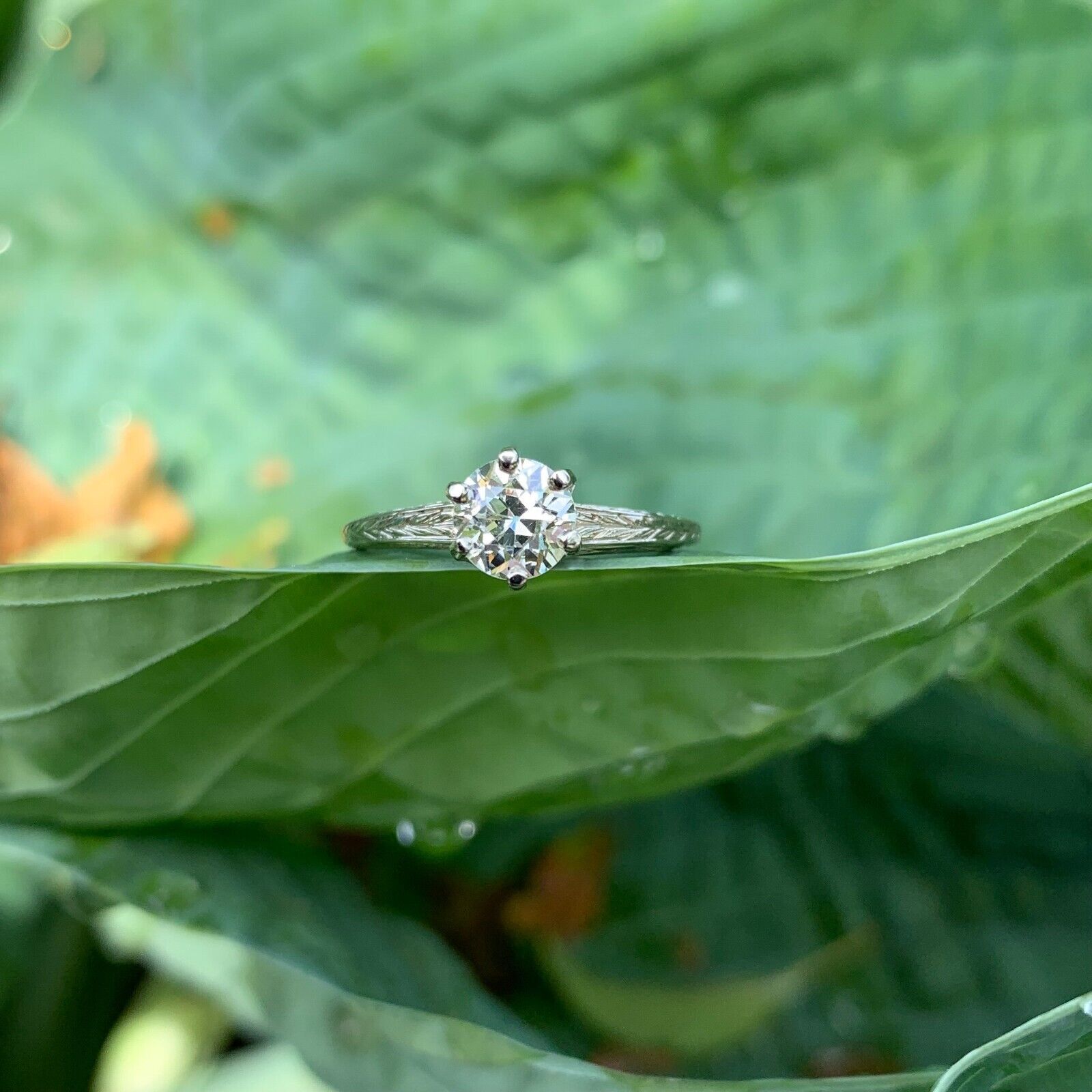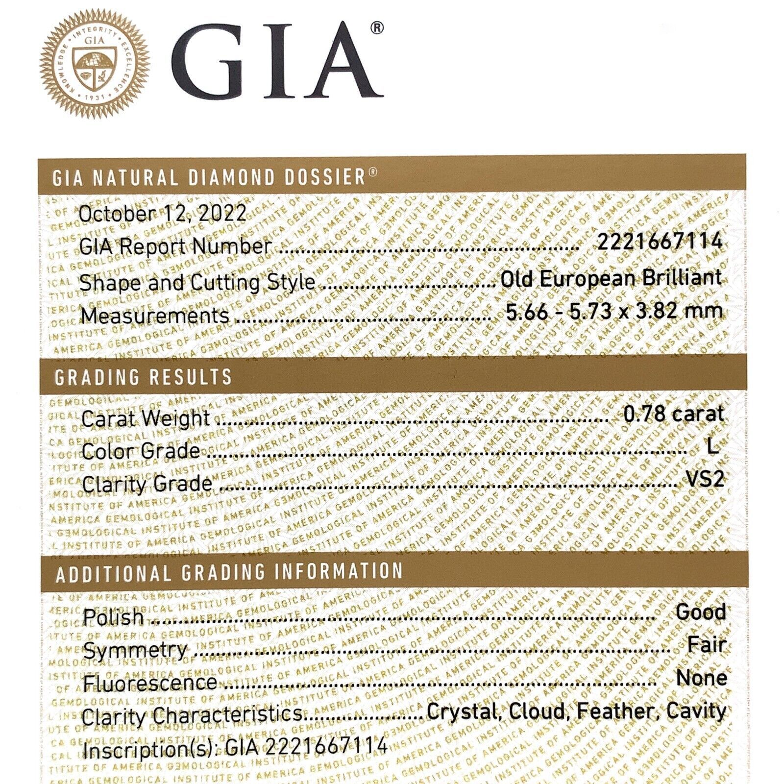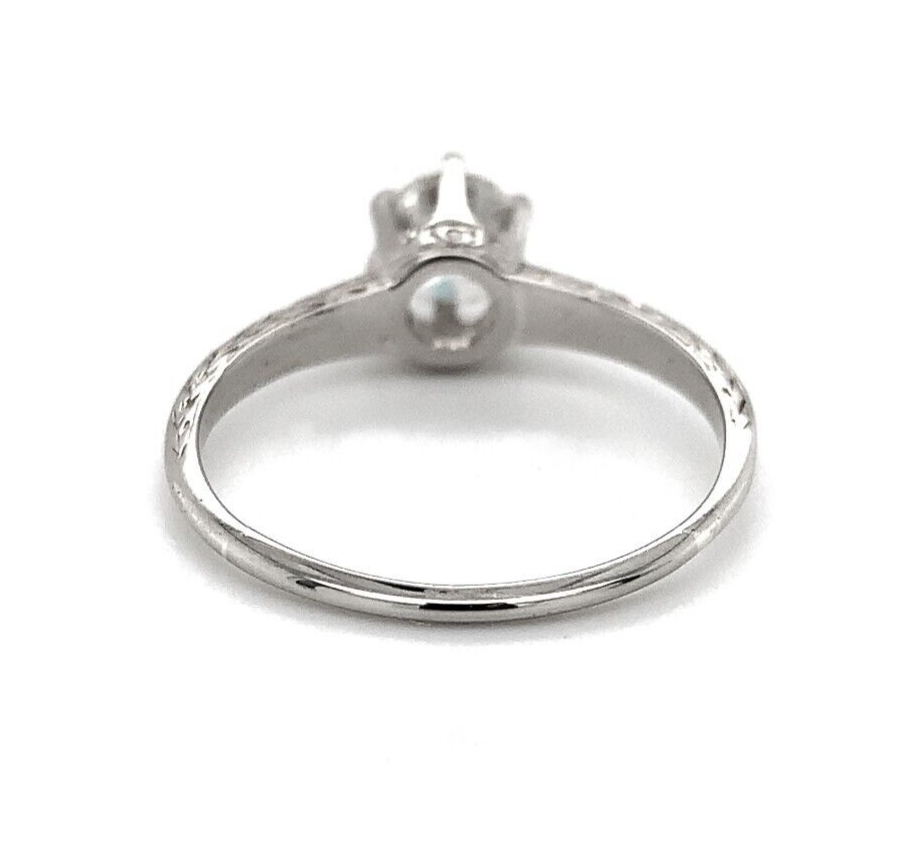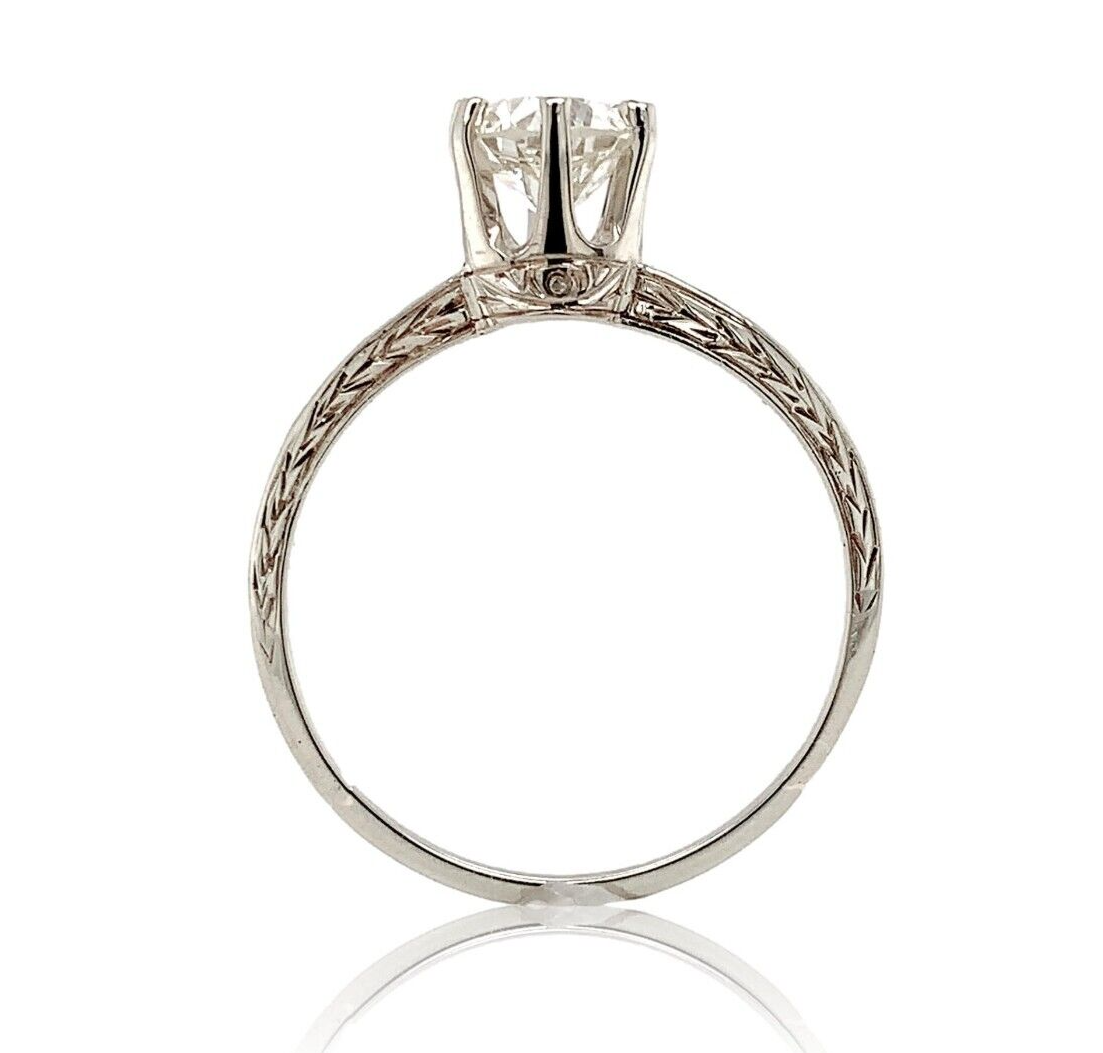 Antique 14k white gold hand engraved .78ct diamond engagement ring. The GIA report #2221667114 states old European brilliant cut natural diamond measuring 5.66mm x 5.73mm x 3.82 mm with L color and VS2 clarity. The diamond is set in six new prongs.
