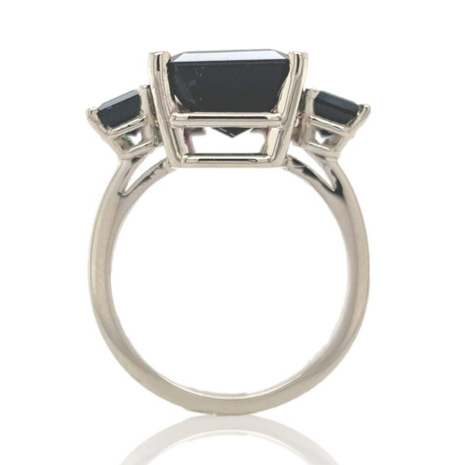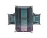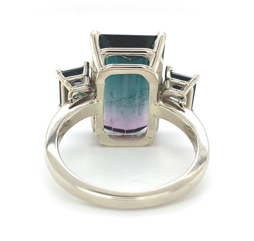 A 14k white gold ring featuring a bi-color watermelon tourmaline weighing 8.07 carats. The tourmaline has dark moody color from teal blue-green to pinkish-purple. The tourmaline is an emerald cut and measures about 14.6mm x 9.7mm. There are two emerald cut teal blue-green tourmaline accents measuring about 6mm x 4mm and weighing 1.33 carats total.