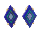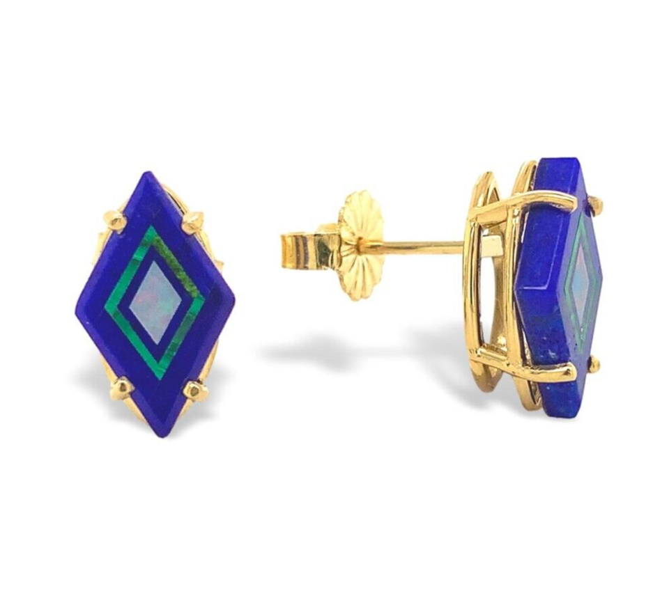 14k Gold Genuine Intarsia Stud Earrings Diamond Shaped Opals Inlaid Lapis #J6961