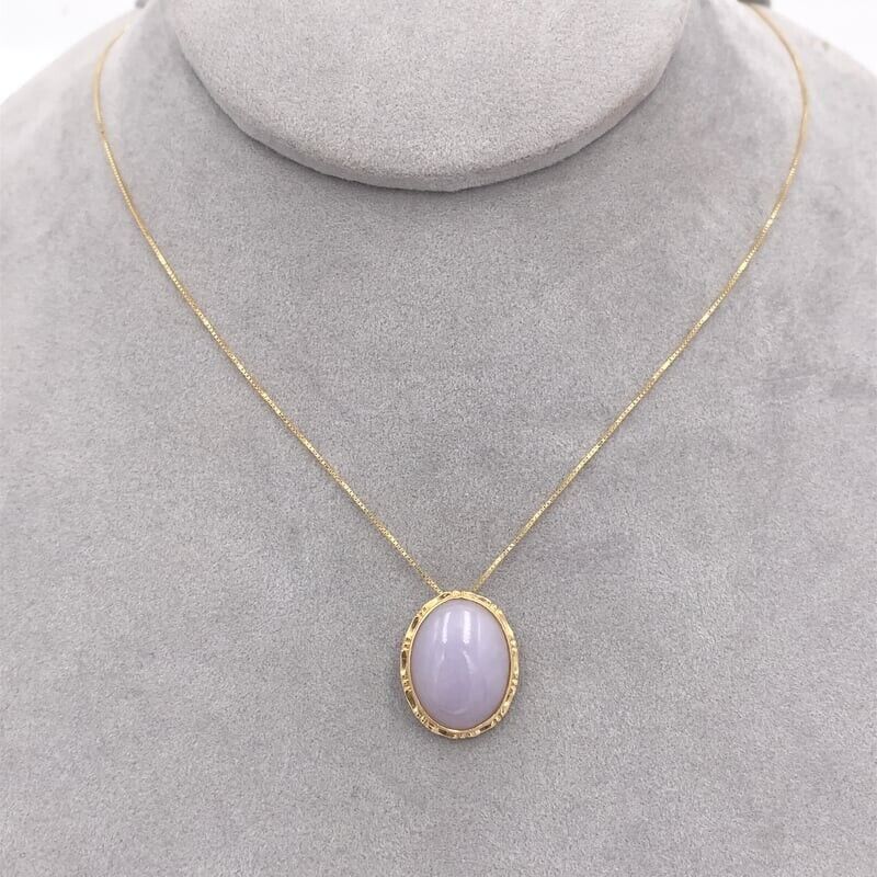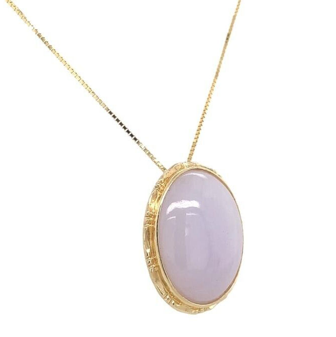 14k yellow gold pendant featuring a light lavender jadeite jade. The jade cabochon measures about 16mm x 12mm. The pendant measures 9/16" x 3/4", and includes an 18" box chain. The necklace weighs 2.79 dwt., and is contemporary. Beautiful!