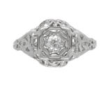 18k white gold filigree .13ct diamond ring. The European cut diamond weighs .13cts, has I1 clarity and H-I color, and measures about 3mm. The diamond is set within and engraved star design. The filigree has pierced leaf/flower designs on each side. It looks like at some point a patch was put on the filigree on both sides, was probably worn next to a band.