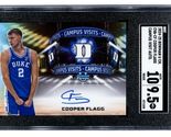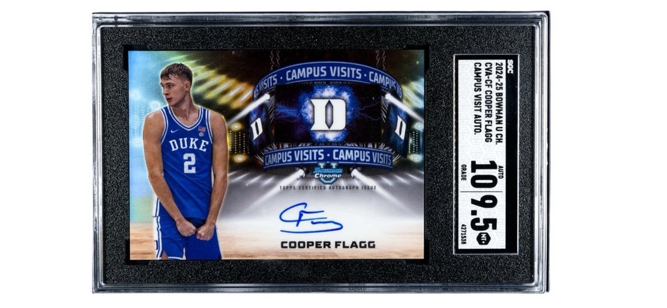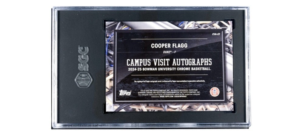 The product is a 2024-25 Bowman Chrome on-card autographed trading card of basketball player Cooper Flagg from the Duke Blue Devils. This rookie card, part of the Campus Visit Autographs insert set, features a limited print run and is authenticated by Topps. Made of aluminum and card stock, this modern-era SGC 9.5 collectible is a valuable addition to any basketball card collection for fans of NCAA basketball.