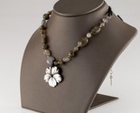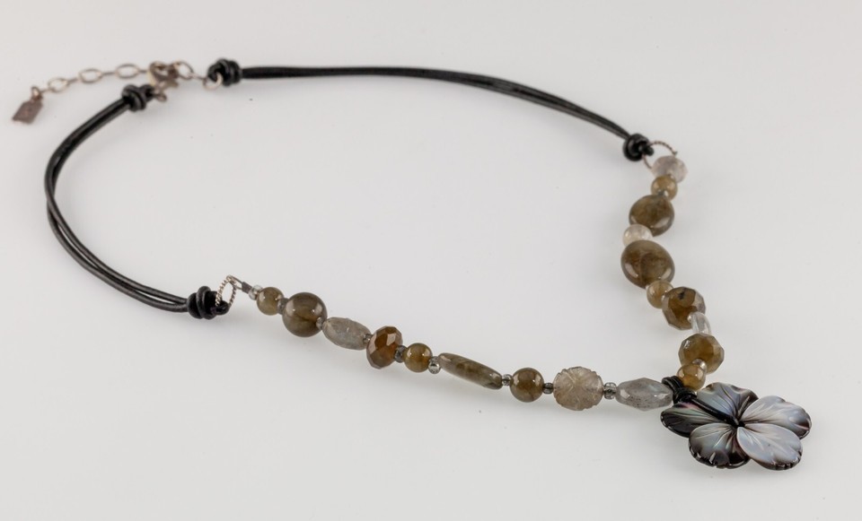 Features Abalone Carved Flower Pendant Suspended on Silver and Leather Necklace
