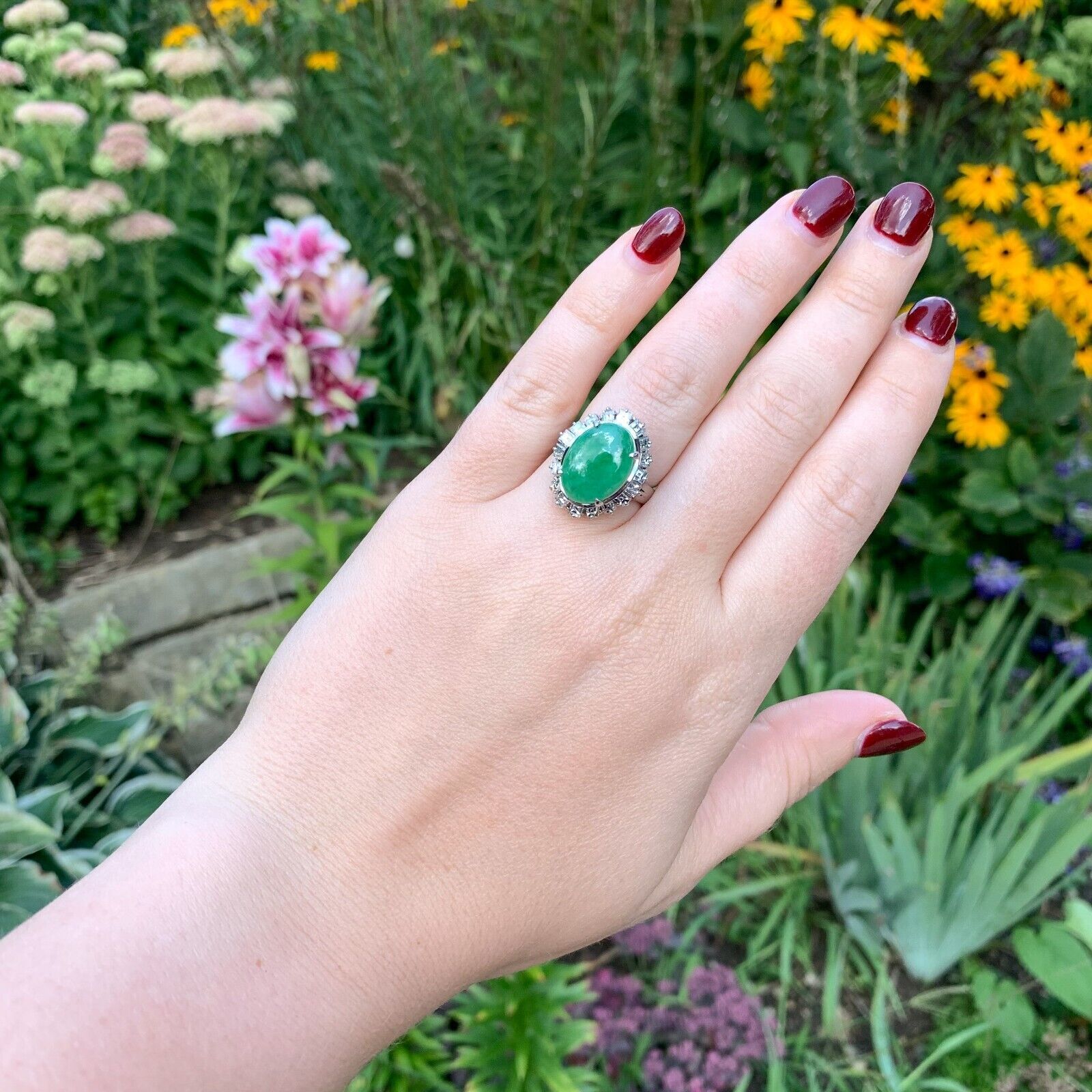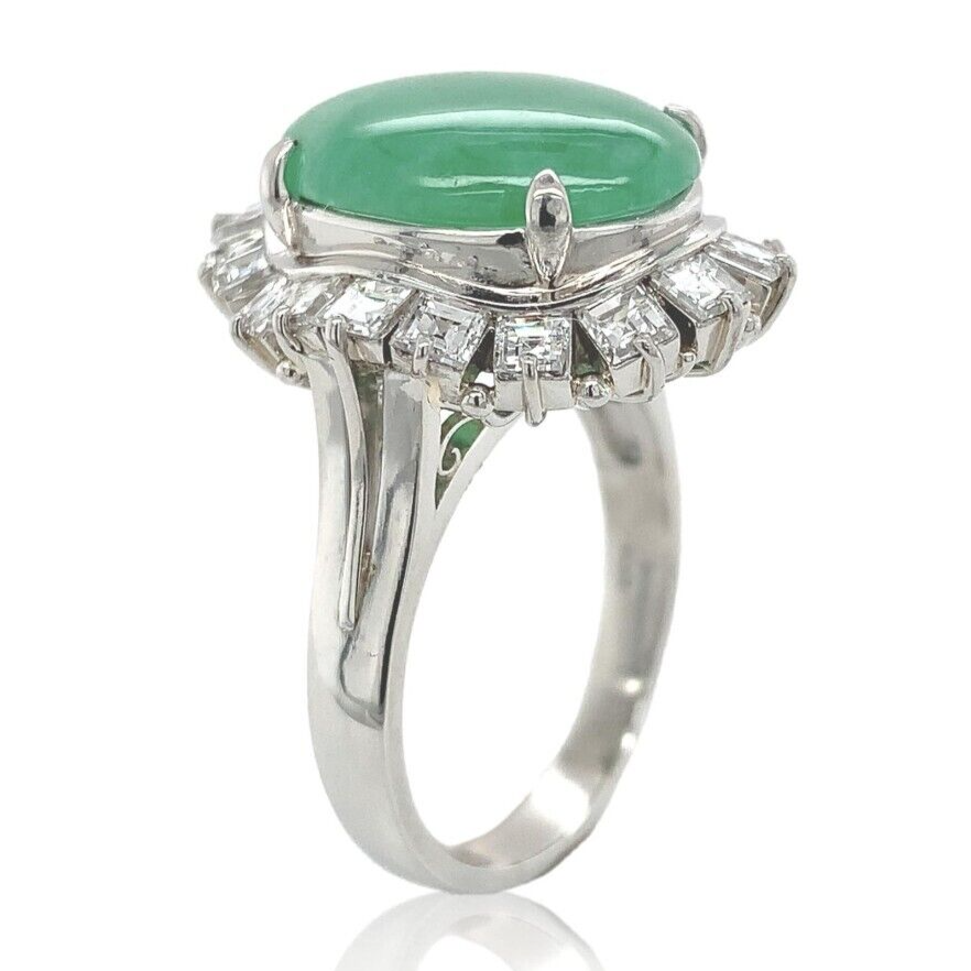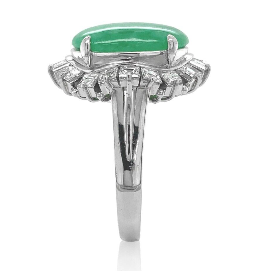 900 Platinum ring featuring a large oval green jadeite jade cabochon. The jade has a GIA report #2225447566 stating natural jadeite grade A, not dyed. The jade measures 15.02mm x 11.09mm x 3.51mm and is translucent with green color - no modifiers. It weighs about 5 carats by estimation.