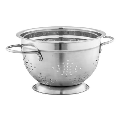 This classic colander from Avanti features stainless steel in a mirror satin finish and has no rolled edges for easier cleaning and pouring.