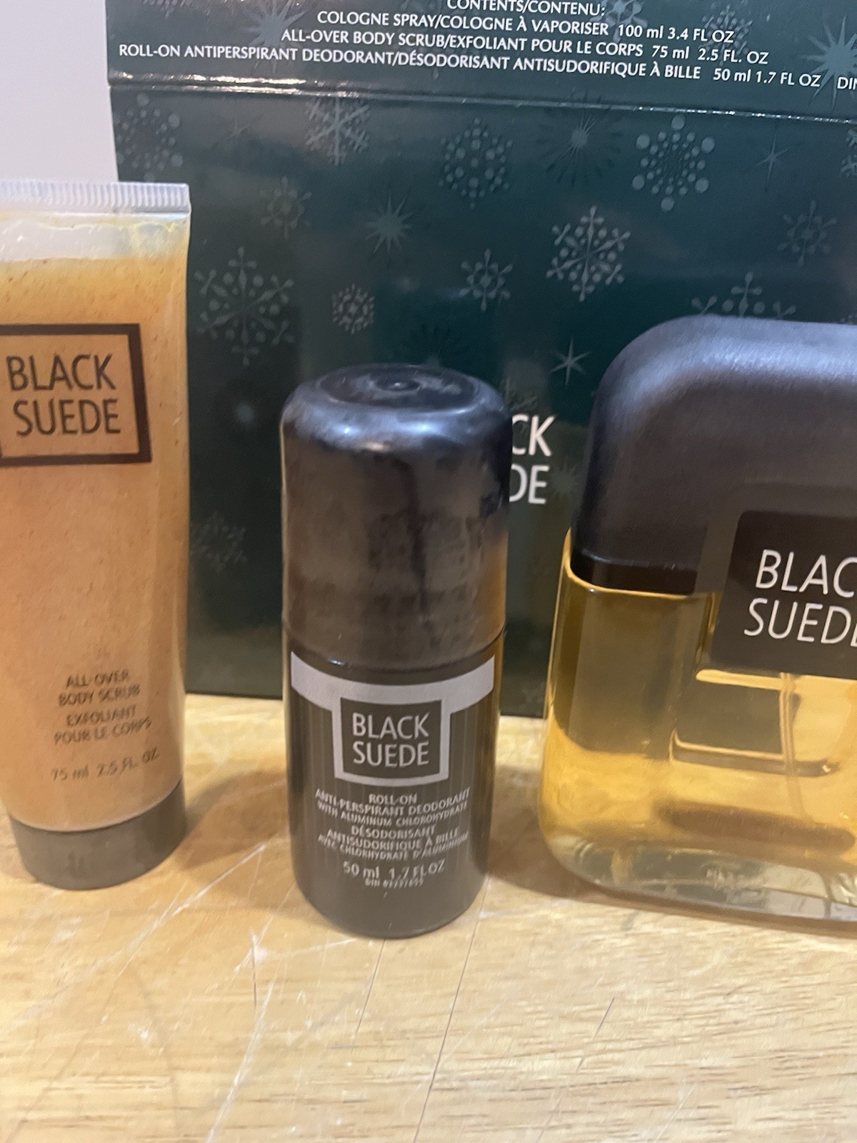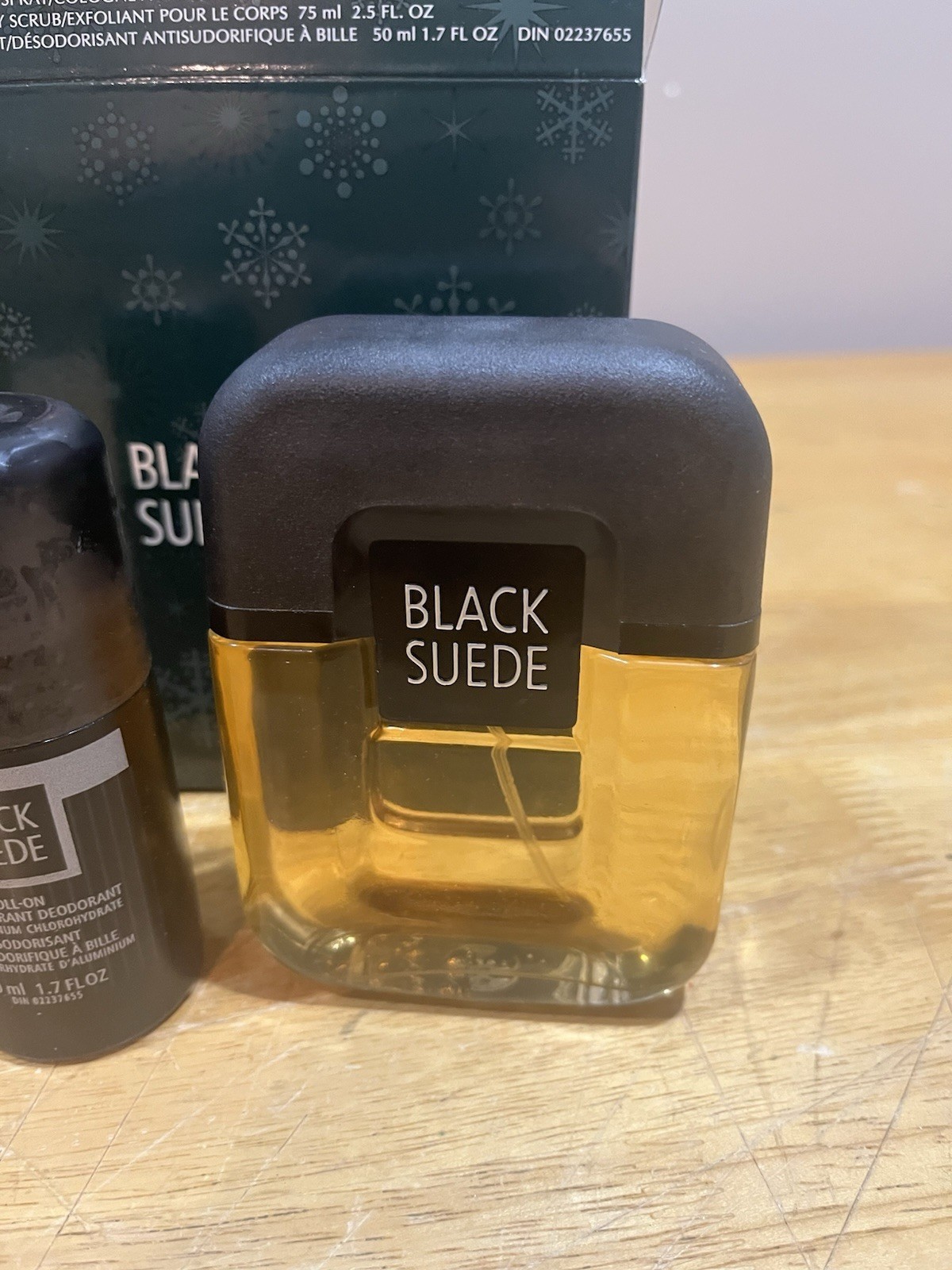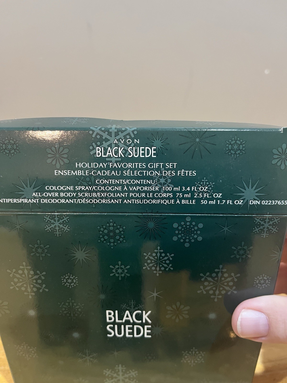 - Avon Vtg Black Suede Holiday Gift Set NOS Cologne Scrub Deodorant