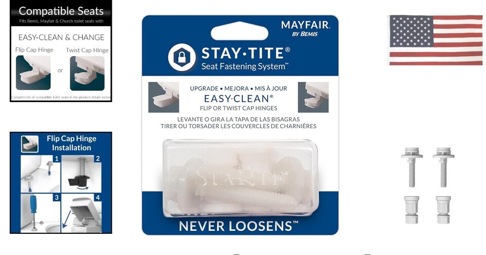 BEMIS Stay Tite Toilet Seat Fastening Hardware Upgrade Kit, White, Metal, 1 Pack, 3/8 in x 2-1/4 in Bolts, Compatible with Bemis Church Seats ? ? ? ? ? ? ? ? ? ? ? ? ? ? ? ? ? ? BEMIS Stay Tite Toilet Seat Fastening Hardware Upgrade Kit Transform Your Toilet Experience with Unmatched Stability and Ease The BEMIS Stay Tite Toilet Seat Fastening Hardware Upgrade Kit is meticulously engineered to provide a secure and effortless installation process while enhancing the longevity of your toilet seats. Elevate your bathroom experience with this essential upgrade. Product Details: Upgrade your toilet seat: Use any Easy Clean Change Seat to Stay·Tite with the Stay·Tite Hardware Upgrade Kit. Innovative Fastening System: Enjoy peace of mind with a system that never loosens, ensuring your seat remains securely in place. Product Dimensions: Bolts measure 3/8" x 2-1/4" and include a standard residential nut of the same size. Compatibility: Designed for use with all Bemis, , and Church toilet seats featuring Easy Clean Change hinges, Flip hinges, or Twist Cap hinges. Why Choose BEMIS? Decades of Trust: With over 60 of manufacturing excellence, BEMIS sets the standard for quality toilet seat designs that seamlessly integrate into any bathroom aesthetics. Innovative Features: Our products are crafted with unmatched features that prioritize your comfort and everyday convenience. Ecological Responsibility: As part of a company with a rich legacy since 1901, we are committed to ecological preservation and responsible manufacturing practices. Experience the BEMIS Difference Reimagine your toilet seat experience with the BEMIS Stay Tite Toilet Seat Fastening Hardware Upgrade Kit. From superior stability to an easy installation process, this upgrade ensures you enjoy every moment in your bathroom retreat. Enhance both safety and style with a product crafted by a pioneer in the industry?choose BEMIS for reliability and innovation. Your toilet deserves the best. Upgrade today and experience a new level of comfort! Shipping Free Fast Shipping - We offer free shipping to most of the USA with a normal delivery time of 3-7 days. However, due to the current situation, additional delivery time (up to 3 weeks) may be required for some items. Alternative Carriers - We may use alternative carriers (e.g. USPS, FedEx, UPS, etc.) to ensure your package arrives safely and on time. Due to the use of multiple carriers, we are unable to provide a tracking number automatically. Handling Time - Orders are processed and shipped within 1-2 business days of receiving cleared payment. Shipping Restrictions - Shipping to Alaska, Hawaii, Puerto Rico, Guam, and other US territories may incur shipping charges or delivery restrictions. Please contact us before ordering, or your order can be refunded/cancelled. State Restrictions - There may be restrictions based on your state of purchase. For example, certain items may not be shipped to California due to state regulations. Contact for Tracking Updates - If you require tracking updates or have any concerns about the delivery of your order, please feel free to contact us, and we will be happy to assist you. Return 30-Day Hassle-Free Returns - We want you to be completely satisfied with your purchase. If you are not, you can return the item within 30 days of receiving it for a full refund or exchange. Easy Return Process - To start a return, simply contact us and we will provide you with a prepaid return shipping label and detailed instructions. Restocking Fee - There are no restocking fees for returns. However, the buyer is responsible for return shipping costs if the return is not due to a seller's error. Refund Processing Time - Refunds will be processed within 5 business days of receiving the returned item in its condition. Payment We accept all major credit cards, PayPal, and Apple Pay for your convenience. Your payment information is secure and encrypted to ensure a safe and seamless transaction. Please complete your payment within 3 days of purchase to avoid any delays in shipping. Feedback Your feedback is extremely important to us. We strive to provide the best products and customer service possible. If you are satisfied with your purchase, please take a moment to leave us a positive review. If you have any concerns or issues with your order, please contact us before leaving negative feedback. We are committed to resolving any problems and ensuring your satisfaction. Contact Us If you have any questions or concerns, please feel free to out to our customer support team. You can contact us through the messaging system. We are available Monday to Friday, 9:00 am to 5:00 pm EST, and we will do our best to respond to your inquiry within 24 hours. Buy it now and enjoy a pleasant shopping experience! UPC: 073088018809 Unit Quantity: 1 Package Dimensions LxWxH: 8 x 2 x 0 (not applicable) Size: 1 count (pack of 1) Material: Metal Suitable For: Does not apply,Bemis,Mayfair,Church toilet seats Features: Does not apply,Easy Clean Change Seat,Stay·Tite Fastening System Room: Bathroom,Does not apply Compatible Model: Does not apply,Bemis toilet seats,Mayfair toilet seats,Church toilet seats MPN: Does not apply Color: White Number in Pack: 1