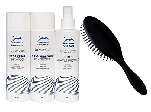Product description: The 4pc Human Hair Must Haves by BeautiMark contains the essential cleansing products needed to properly care for and extend the life of your human hair wigs, hair toppers, and ha no no ir pieces. BeautiMark Pure Care Collection was formulated to treat and protect chemically processed human hair with safe and effective ingredients to naturally nourish and hydrate. Adding luster and moisture to hair while not weighing it down is the magic in the Pure Care products! Hydrating Shampoo is packed with nourishing ingredients to cleanse and protect your human hair investment. Intensive Recovery Conditioner is unmatched in delivering nutrients to extend the life and natural movement of your hair! 3-in-1 Miracle Protect is a heat and UV protectant which detangles and leaves your hair soft and easy to comb through. Make maintaining your human hair simple with the 3pc Human Hair Must Haves. FREE of toxic glycols, sulfates, phthalates, parabens, DEAs, artificial dyes and fragrances, these products work hard to protect and hydrate your hair without harsh ingredients. Scented with all natural essential oils, you'll be relaxed with a delicate, refreshing scent while caring for your hair. 4pc Human Hair Must Haves Includes: 1 - 8oz. Hydrating Shampoo 1 - 8oz. Intensive Recovery Conditioner 1 - 8oz. 3-in-1 Miracle Protect 1 - Human Hair Wig Brush 1 - 19 pg How to Guide