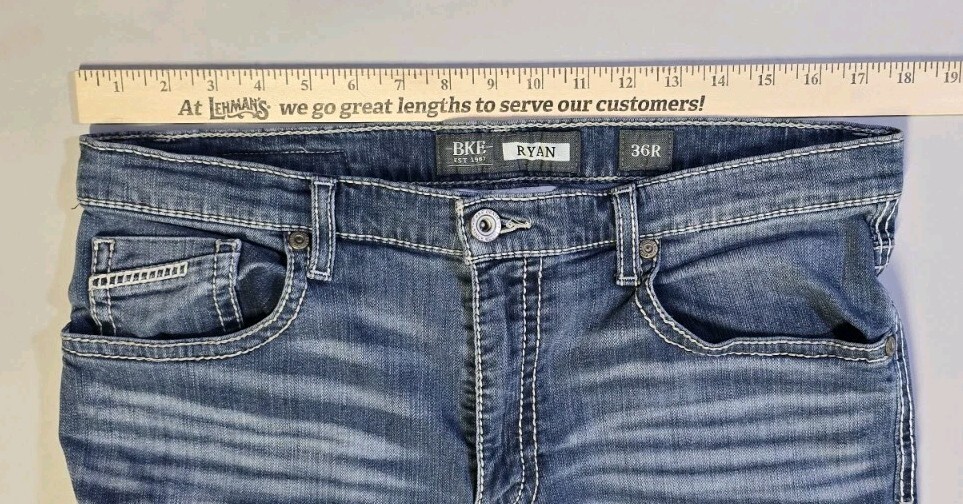 Labeled 36 waist measured 35. Please see photos. BKE Ryan Straight Leg Jeans in Mens size 36R are a stylish and versatile addition to any wardrobe. Made from a comfortable cotton blend denim with a mid-rise and straight fit, these jeans feature a zip closure and 5-pocket design for added convenience. The blue color and embroidered logo accents add a touch of flair, while the stretch fabric ensures a comfortable and flexible feel. Perfect for all seasons, these jeans from Buckle are machine washable and easy to care for, making them a practical and fashionable choice for any man.
