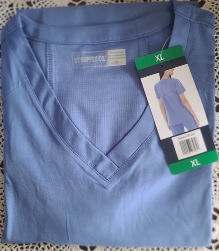 This sale is for One (1) BT Supply Co Brand Scrub Top Ladies' Size Extra Large (XL) Size conversion = Size 16 Back body length measures approximately 29.25" V-Neck Blue in color Front princess seams Vented mesh back yoke Side slits @ hem Short sleeves Two (2) deep ~ front patch pockets with inner pocket bungee cord 90% Polyester ~ 10% Spandex ~ Quick Drying Fabric Trim ~ 100% Polyester Lightweight Machine wash ~ Tumble dry Scrub top is new with tags Please view photos for a good description of this item Thank you!