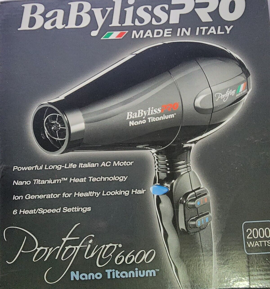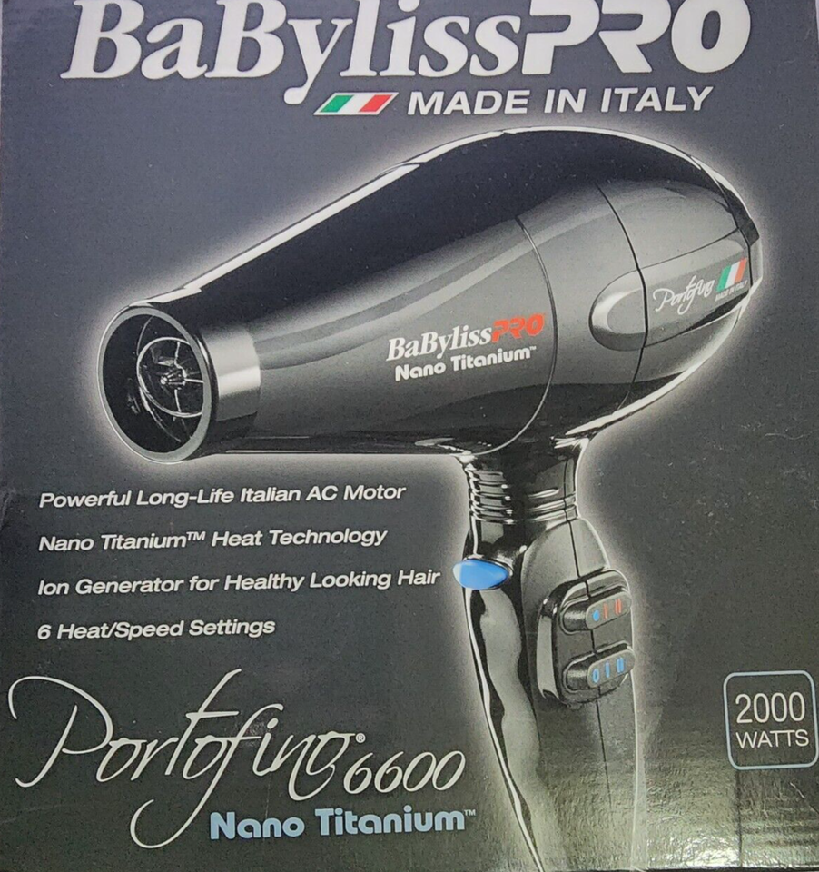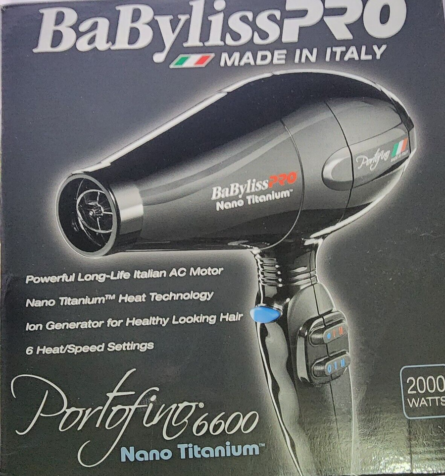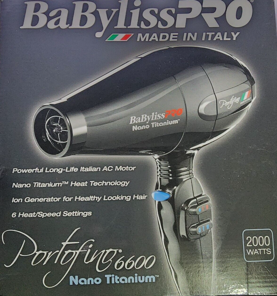 You are Buying a Brand New And Factory Sealed Babyliss Pro Nano Titanium Portofino 6600 Hair Dryer (BNT6610).... Equipped with a high performance 2000-watt Italian motor, the Portofino 6600 is enhanced with Nano Titanium? technology to distribute heat evenly for optimal results. The negative ions generated by the dryer will remove any static electricity in the hair and close the cuticle for smooth, shiny results.