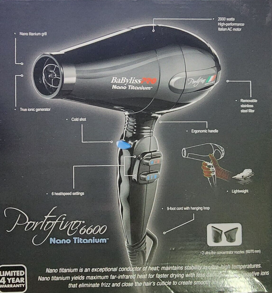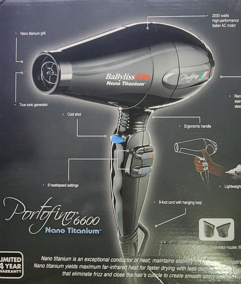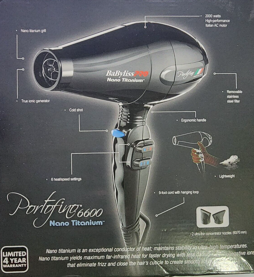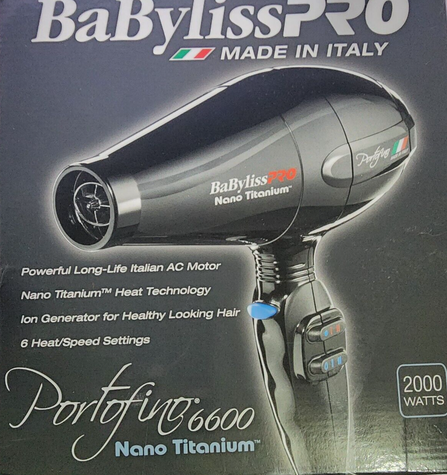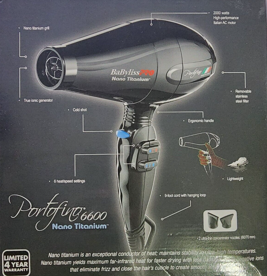 You are Buying a Brand New And Factory Sealed Babyliss Pro Nano Titanium Portofino 6600 Hair Dryer (BNT6610).... Equipped with a high performance 2000-watt Italian motor, the Portofino 6600 is enhanced with Nano Titanium? technology to distribute heat evenly for optimal results. The negative ions generated by the dryer will remove any static electricity in the hair and close the cuticle for smooth, shiny results.