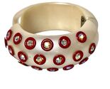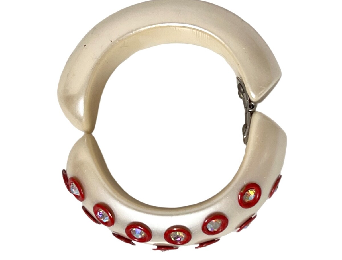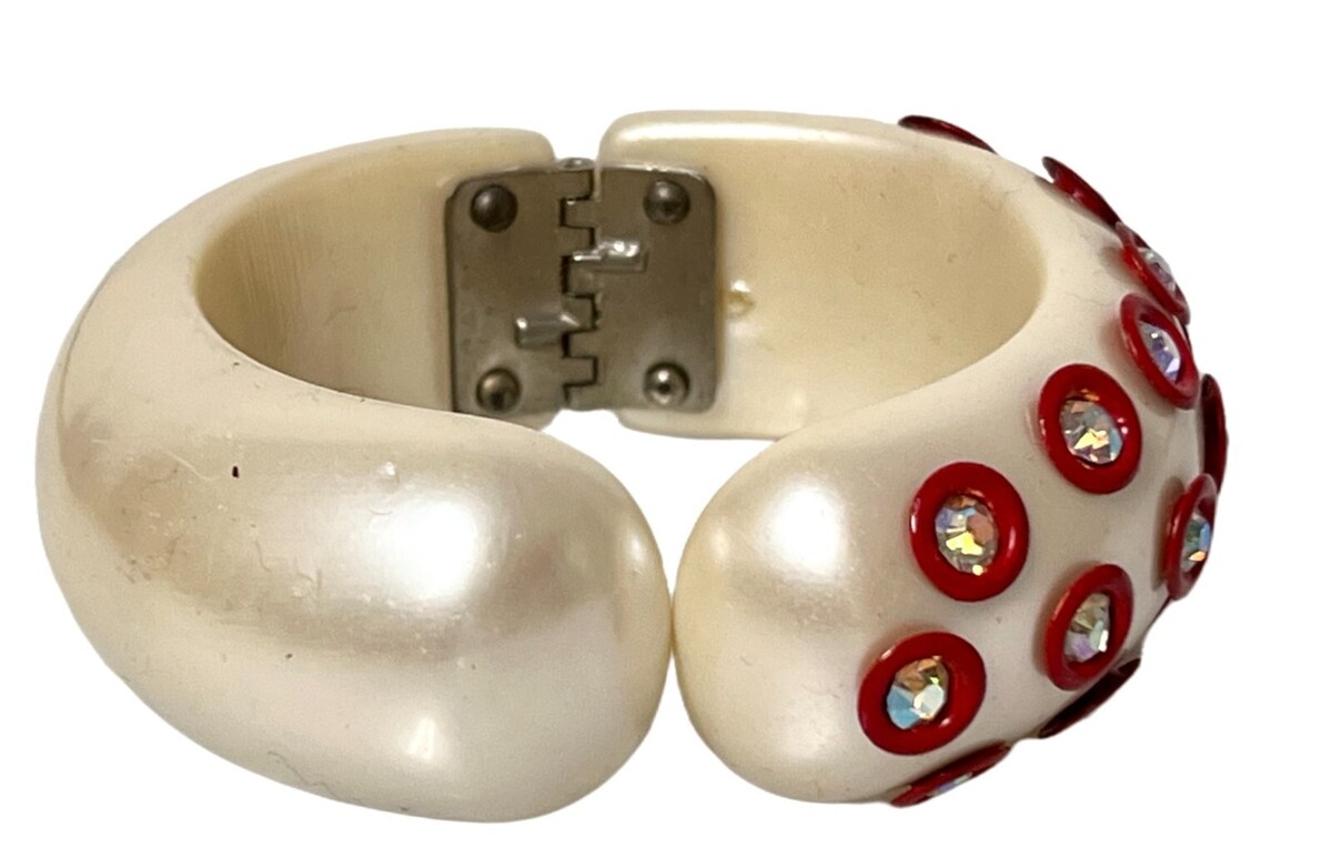- Bakelite Pearlized White Hinged Cuff Bracelet Vintage Red circles Rhinestones