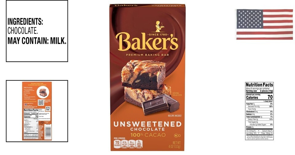 Baker's Unsweetened Chocolate Baking Bar, 100% Cacao, 4 oz (113 g) ? ? ? ? ? ? ? ? ? ? ? ? ? ? ? ? ? ? ? ? Baker's Unsweetened Chocolate Baking Bar Discover the artisanal quality infused in each 4 oz (113 g) bar of Baker's Unsweetened Chocolate, crafted from 100% cacao. Perfect for the discerning baker looking to elevate their culinary creations with the unmatched richness of authentic chocolate. Features: 100% Cacao content delivers a deep and robust chocolate flavor. Designed for versatility, perfect for brownies, cheesecakes, cakes, and more. Newly scored bar design snaps cleanly into 1/4 ounce pieces for easy measurement. Paper wrapper keeps unused portions fresh until your next baking adventure. Each 4 oz bar offers exceptional quality with no added ingredients. Benefits: Indulge in the pure, unadulterated flavor of real chocolate. Easily melt and incorporate into your favorite recipes for a decadent touch. Perfectly portioned pieces allow for precision baking, ensuring consistent results. Great for both professional bakers and home cooks alike. Enhances both sweet and savory dishes, giving you versatile culinary possibilities. Why choose Baker's Unsweetened Chocolate? Elevate your baking game with Baker's Unsweetened Chocolate, recognized for its purity and flavor. Specifically designed for the discerning palate, this baking bar is your secret ingredient to achieving rich, chocolatey perfection across a variety of desserts. Enjoy the blend of quality, taste, and ease of use, making it an essential in every kitchen. Treat yourself, and create delightful memories with every bite - order your Baker's Unsweetened Chocolate Baking Bar today! Shipping Free Fast Shipping - We offer free shipping to most of the USA with a normal delivery time of 3-7 days. However, due to the current situation, additional delivery time (up to 3 weeks) may be required for some items. Alternative Carriers - We may use alternative carriers (e.g. USPS, FedEx, UPS, etc.) to ensure your package arrives safely and on time. Due to the use of multiple carriers, we are unable to provide a tracking number automatically. Handling Time - Orders are processed and shipped within 1-2 business days of receiving cleared payment. Shipping Restrictions - Shipping to Alaska, Hawaii, Puerto Rico, Guam, and other US territories may incur shipping charges or delivery restrictions. Please contact us before ordering, or your order can be refunded/cancelled. State Restrictions - There may be restrictions based on your state of purchase. For example, certain items may not be shipped to California due to state regulations. Contact for Tracking Updates - If you require tracking updates or have any concerns about the delivery of your order, please feel free to contact us, and we will be happy to assist you. Return 30-Day Hassle-Free Returns - We want you to be completely satisfied with your purchase. If you are not, you can return the item within 30 days of receiving it for a full refund or exchange. Easy Return Process - To start a return, simply contact us and we will provide you with a prepaid return shipping label and detailed instructions. Restocking Fee - There are no restocking fees for returns. However, the buyer is responsible for return shipping costs if the return is not due to a seller's error. Refund Processing Time - Refunds will be processed within 5 business days of receiving the returned item in its condition. Payment We accept all major credit cards, PayPal, and Apple Pay for your convenience. Your payment information is secure and encrypted to ensure a safe and seamless transaction. Please complete your payment within 3 days of purchase to avoid any delays in shipping. Feedback Your feedback is extremely important to us. We strive to provide the best products and customer service possible. If you are satisfied with your purchase, please take a moment to leave us a positive review. If you have any concerns or issues with your order, please contact us before leaving negative feedback. We are committed to resolving any problems and ensuring your satisfaction. Contact Us If you have any questions or concerns, please feel free to out to our customer support team. You can contact us through the messaging system. We are available Monday to Friday, 9:00 am to 5:00 pm EST, and we will do our best to respond to your inquiry within 24 hours. Buy it now and enjoy a pleasant shopping experience! UPC: 897922002928 Expiration Date: See description Calories per 100 g/mL: Unknown Course: Baking Number in Pack: 1 Unit Quantity: 4 oz Food Specifications: Gluten Free,Organic Allergens: Drink immediately for a superfood boost MPN: Does Not Apply Flavor: Unsweetened Product: Cooking Chocolate Cocoa Form: Bar Type: Unsweetened Chocolate Calories per Serving: 20 Number of Servings: 90 Serving Size: 1 Tbsp ( 5g ) Item Weight: 4 oz Cocoa Content: 100%