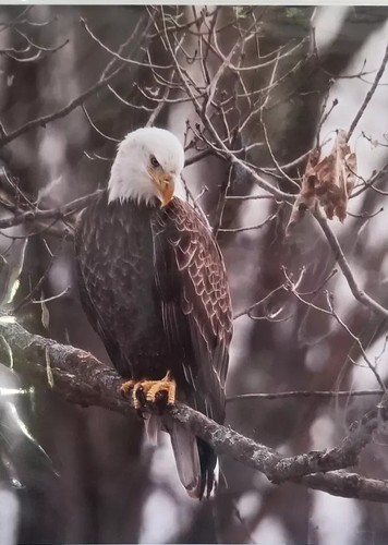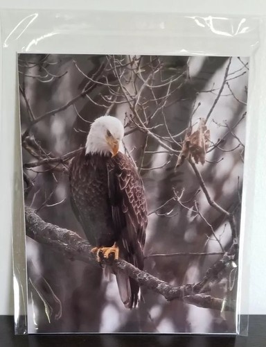 This sale is for one (1) 8" x 10" Photographed Picture Adult Bald Eagle Picture Wooded background ~ Eagle is perched on a tree branch Printed on thick card stock Photographed by myself printed out on cardstock Ready for framing This picture is brand new ~ never used Please view photos for a good description of this picture Thank you!