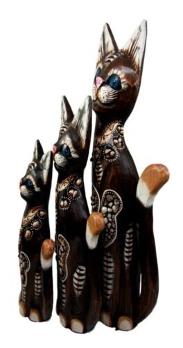 - Balinese Wood Handicraft Blue Eyed Feline Cat Family Set of 3 Figurines 20"H