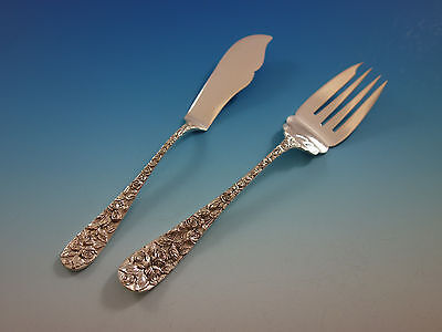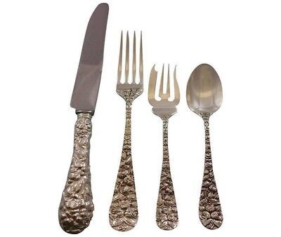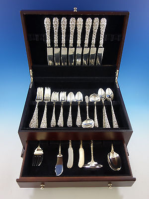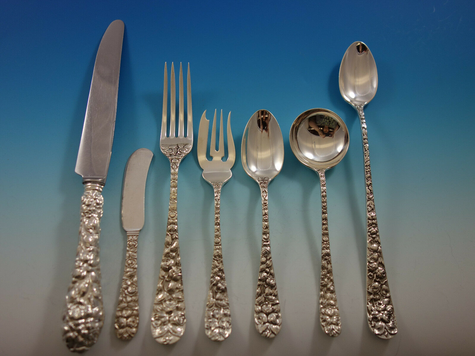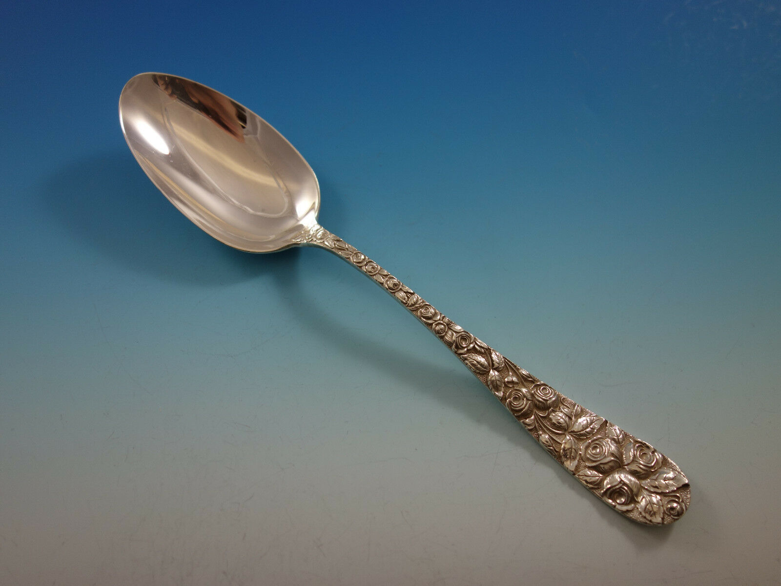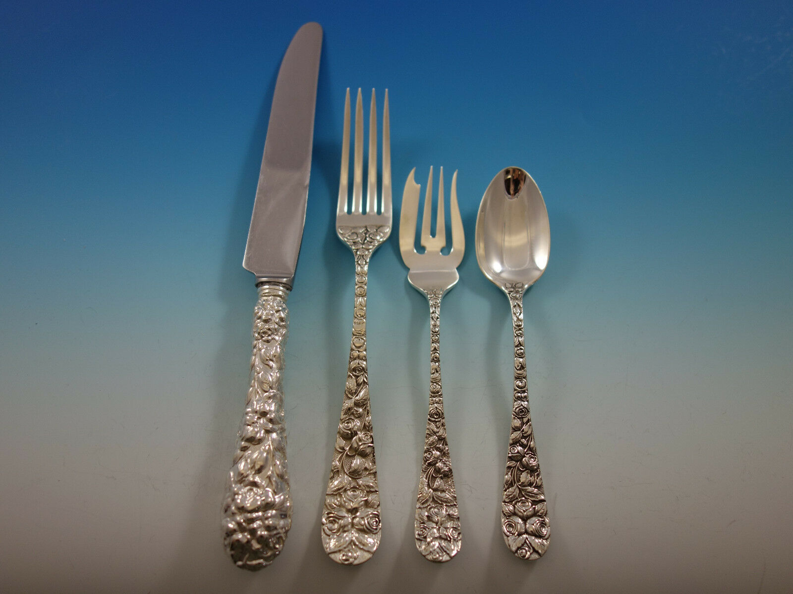 Exquisite repousse Dinner Size Baltimore Rose by Schofield Sterling Silver Flatware set - 59 pieces. This set includes: