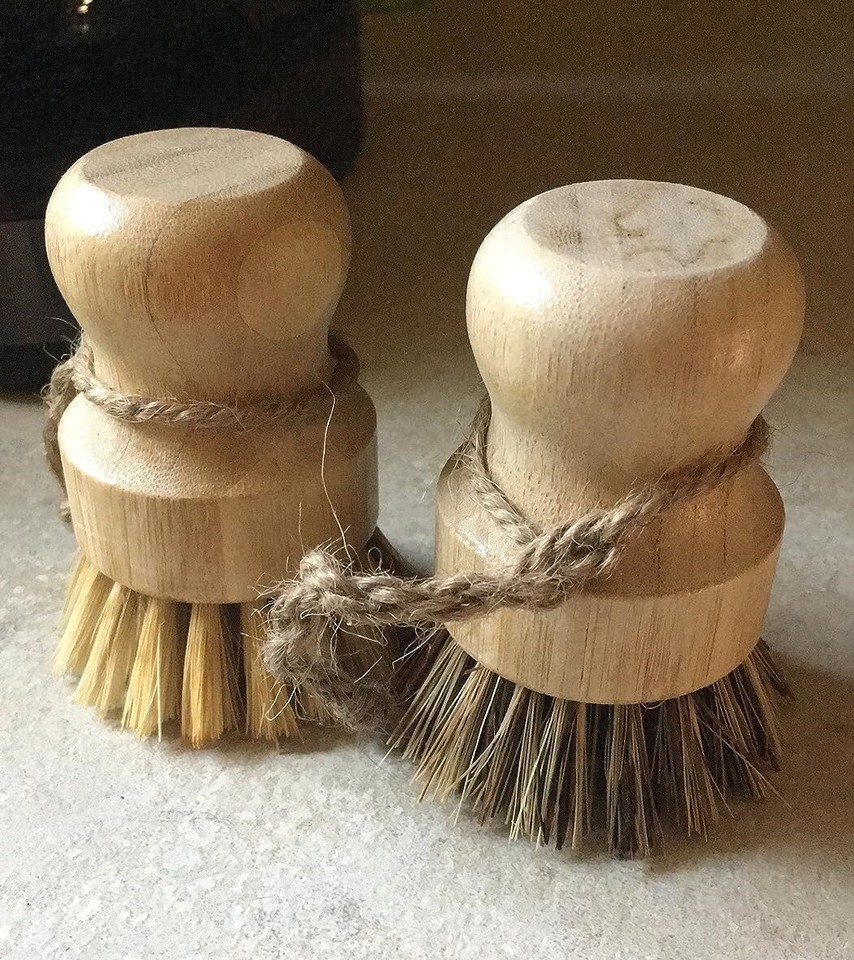 ?2PCS Biodegradable Dish Brush?Bamboo dish brush set are truly made from organic bamboo handle, 1 PCS dark brislte brush: bamboo, union fiber (mixed palm fiber and sisal, hard bristle), 1 PCS brown bristle brush: bamboo, sisal (tampico fiber, medium hard) it's really an eco-friendly and zero waste kitchen bubble up dish brushes.