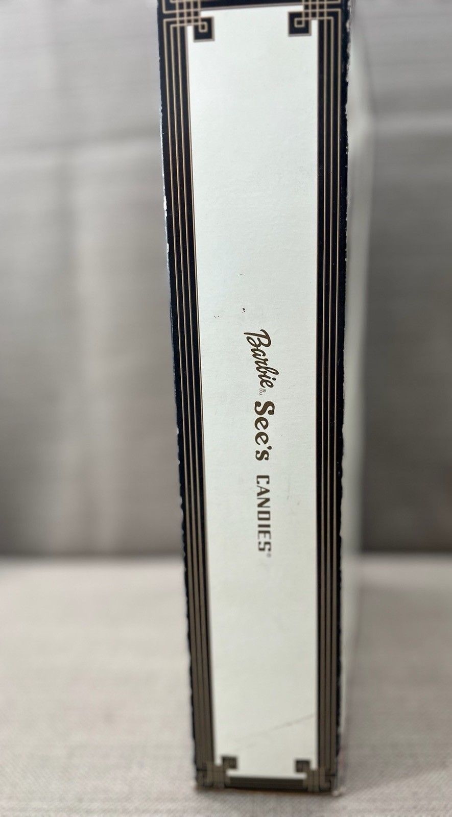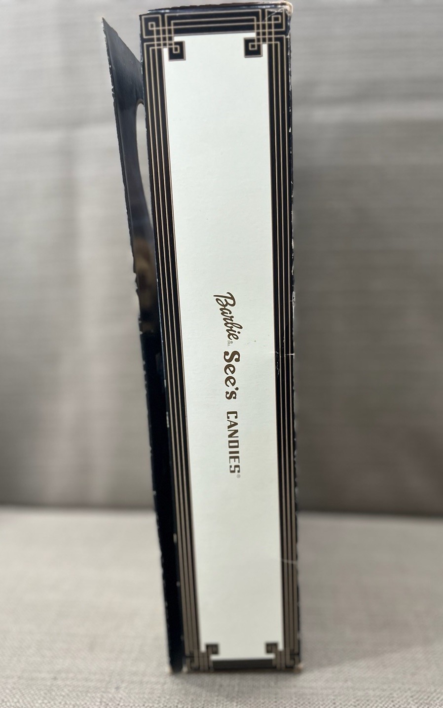 Elegant Special Edition Barbie created in partnership with See?s Candies, celebrating the charm and sophistication of San Francisco. Dressed in a gold satin jacket with faux fur trim, black skirt, gloves, pearls, and a chic hat, Barbie carries a See?s Candies shopping bag in this nostalgic collector set.