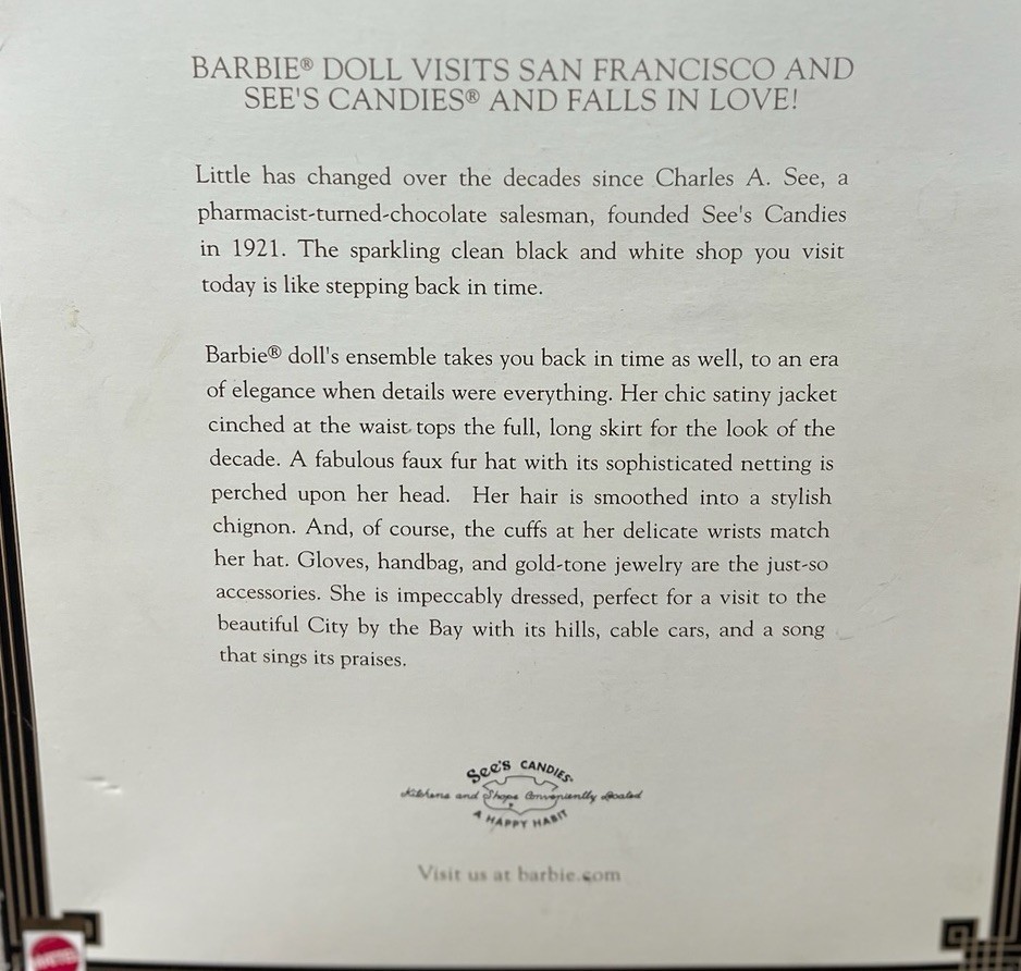 A wonderful collectible for Barbie enthusiasts, San Francisco lovers, or fans of See?s Candies memorabilia.