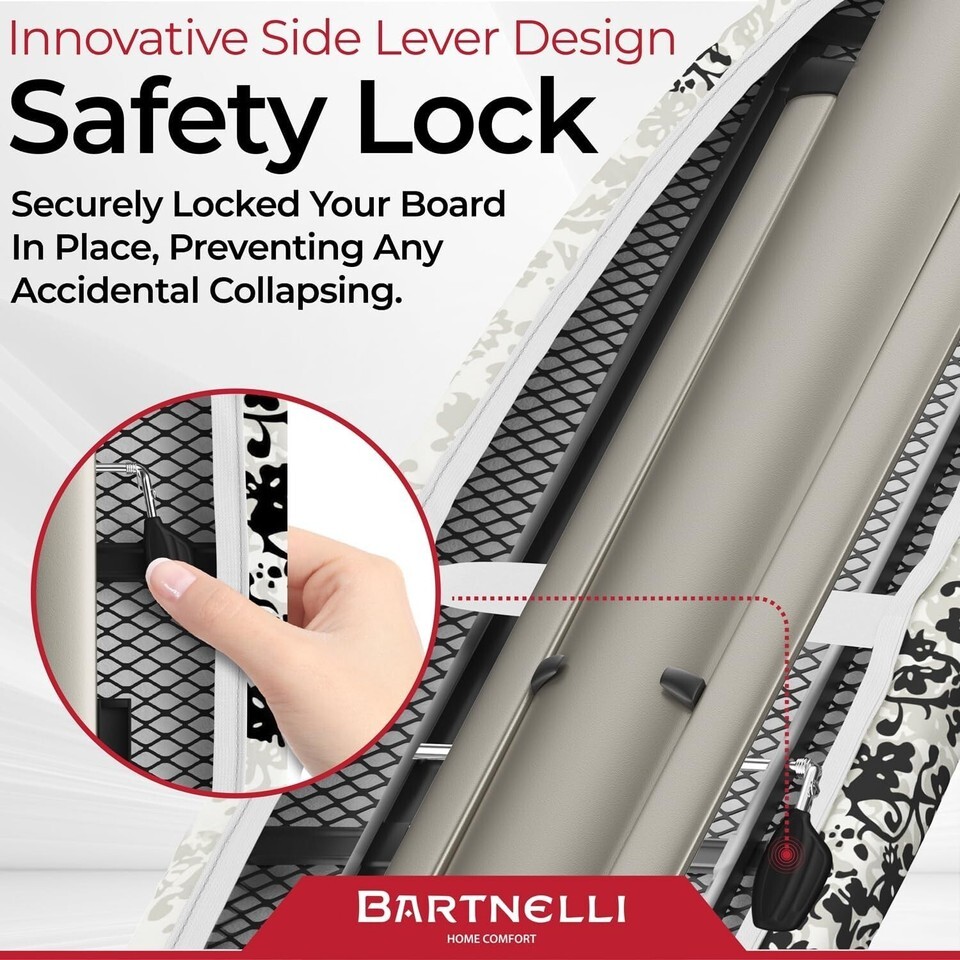 Bartnelli Pro Luxury Extra Wide Ironing Board (Open Box) PRODUCT DESCRIPTION Crafted Elegance Redefined. Experience meticulously crafted European home goods that blend style, quality, and sustainability. Elevate your routine with sophistication. Embrace an elevated lifestyle where elegance meets consciousness. Thrive with Bartnelli's superior craftsmanship and sustainable living today. FEATURES: * STURDY - MANUFACTURED IN THE EU - BUILD TO LAST ? , Not like cheap ironing boards this ironing board is build and designed in the EU with European quality, the unit is safe from Wobbling, heavy duty wide legs and big sized board, all designed to safe and help the unit stay still without any moves while in use, protective plastic shield on the legs to safe your floors from scratches, high quality material to keep the lifespan of the unit for years to come ! * GREAT IRON EXPERIENCE - THICK LAYERED BOARD COVER. -- Extra thick 100% cotton supported by foam works best for withstanding heat and keeping clothes from sticking! The metal mesh top will allow steam to pass through and evaporate. * WASHABLE PAD ? IRON AND STEM IRON REST SHLEF? HANGING RACK The ironing board comes with a washable and changeable cover pads iron and steam iron rest shelf, hanging rack to hang your finished ready clothes helping you while ironing your clothes * HEIGHT ADJUSTABLE ? FOLDABLE ? STORAGE LOCK ? This ironing board is designed to be adjustable, that users can lower and raise as needed to different heights. (30 - 38 inches) it can be folded almost flat to save storage space additionally the iron board will stay locked until you want to open and use it again the handy transport lock keeps the iron table folded when stored or transported. Condition: Open Box Color: White Black- 62x19" Color: Black White with Wheels -51x19" Color: Green Wood- 51x19" Copyright All rights reserved.