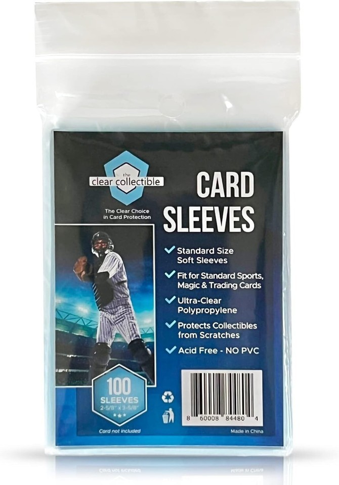 About this item Clear Card Sleeves - Our plastic card sleeves are perfect for use as sports card sleeves, Pokemon card sleeves, MTG card sleeves, or Magic the Gathering card sleeves. Ultra Protection - Each card sleeve will maximize clarity protect your collection from scratches dust. Use our card protectors sleeves on any collectible or game cards you wish to protect. Perfect Fit Compatibility - The 2-5/8" x 3-5/8" (67mm x 92mm) card protector will fit all standard-sized trading cards and optimized for double sleeving with top loaders for cards. Plastic Sleeves For Cards - Perfect to use as football card sleeves, baseball cards sleeves, trading card protectors, Pokemon sleeves, MTG sleeves, sports card sleeves, or playing card sleeves. Clear Sleeves For Cards - Package contains I package of 100 count collectible trading card protective sleeves, totaling 100 card sleeves. Each penny sleeve will keep your collection flawless.
